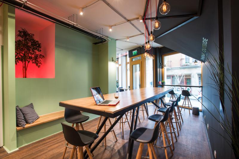 Kávézó, közösségi iroda és bár kombinálása ugyanazon térben.
