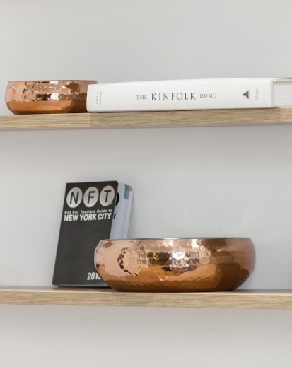 Ugyanakkor a használati tárgyak is elszakadnak az olcsó praktikum világától, designtárgyakat látunk mindenütt: rézszínű komódot és felette rózsaarany dekorációs tálat, só-bors tartót, a nappali kanapéján ügyeltek még a díszpárnára és a plédre is, de még a kanapé feletti polcon látható nád tárolókosár is megér egy-két pillantást.