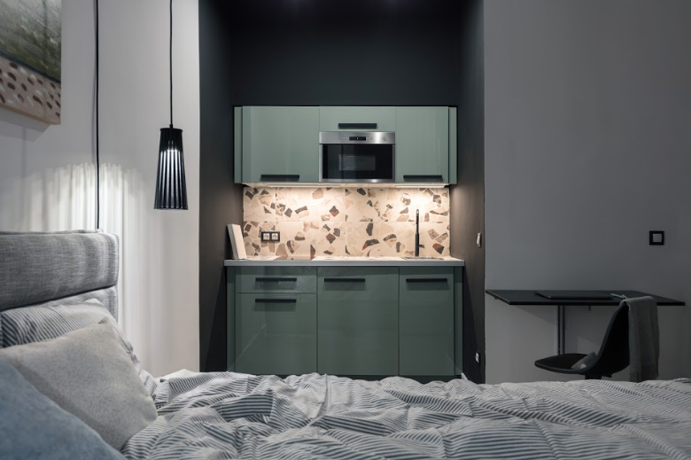 Csak később merült fel az ötlet, hogy a lakásban két apartmant létesítsenek, de a végeredményt illetően a konyha elhelyezése telitalálat volt, hiszen ennek köszönhetően a korábbi állapothoz képest jóval izgalmasabb térkapcsolatok jöhettek létre. Az ausztrál befektető mindenben szabad kezet adott a tervezőknek, így
