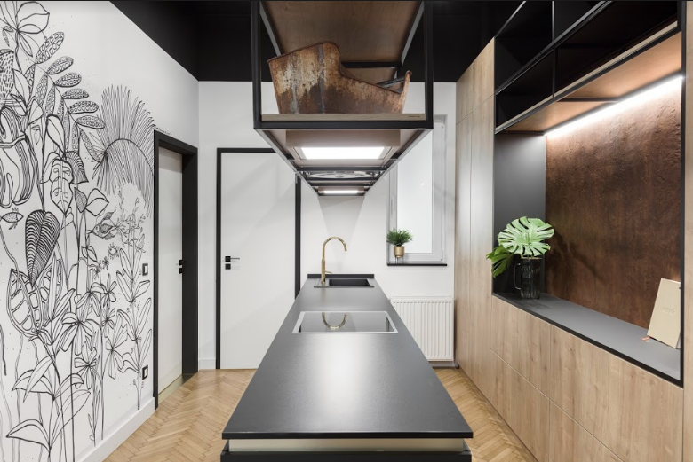 teret nyerhettek kortárs művészek segítségével létrehozott olyan egyedi megoldások, mint a konyhai közlekedő falát díszítő, kézzel festett dzsungel, Anna Amelie falrajza, vagy Keresztury Árpád falból kivésett Budapest térképe, közepén rézcsőből formált Dunával az egyik hálószobában vagy akár a Canada poszter a nappaliban.