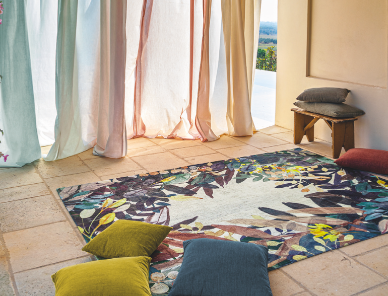 A Christian Fischbacher gyár Estival szőnyegcsaládja a mexikói naiv művészet és kultúra hangulatát idézi, kézzel festett akvarell virágok és vidám levelek díszítik ezt a jacquard alapra szőtt, nyomott mintás poliészter szőnyeget.