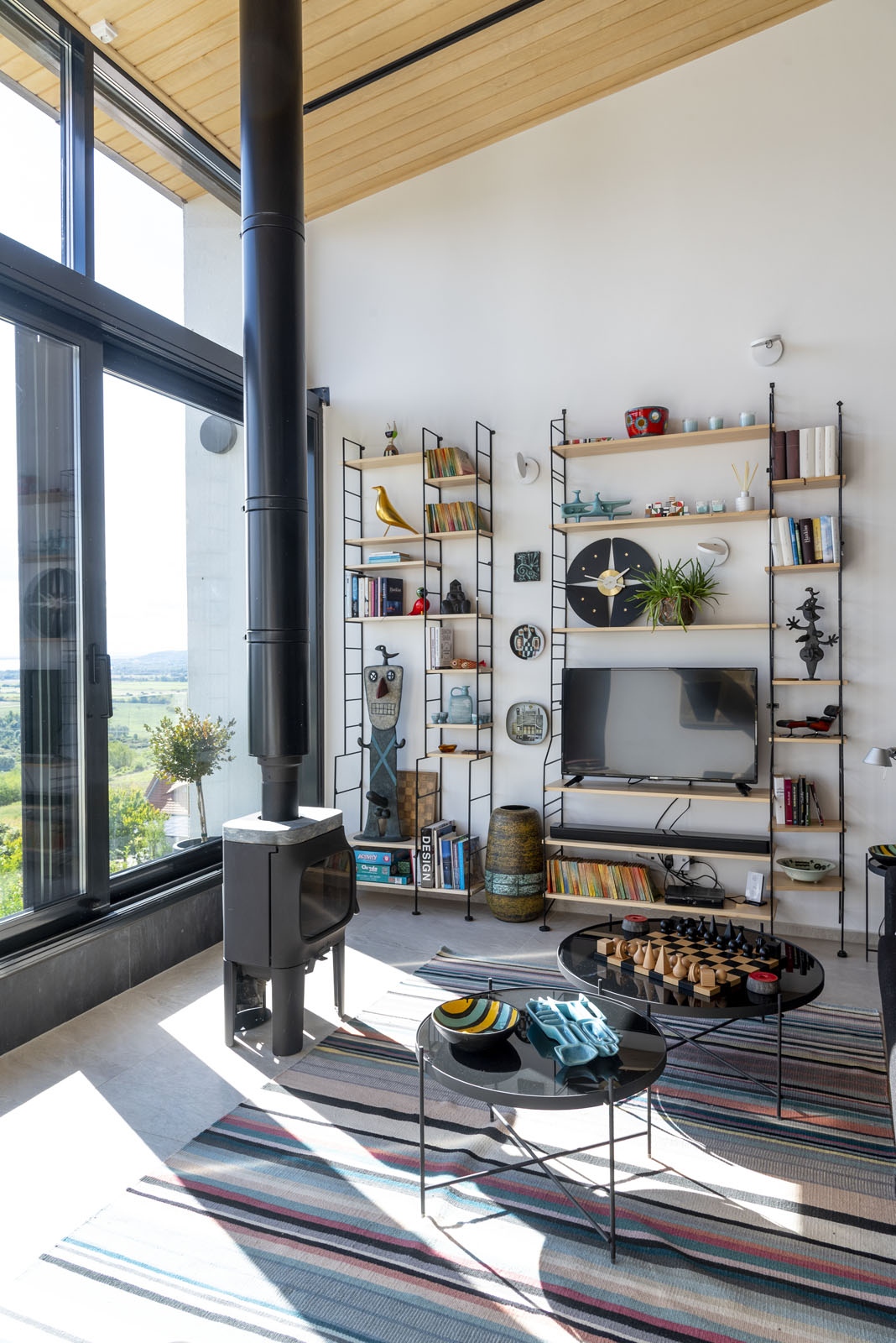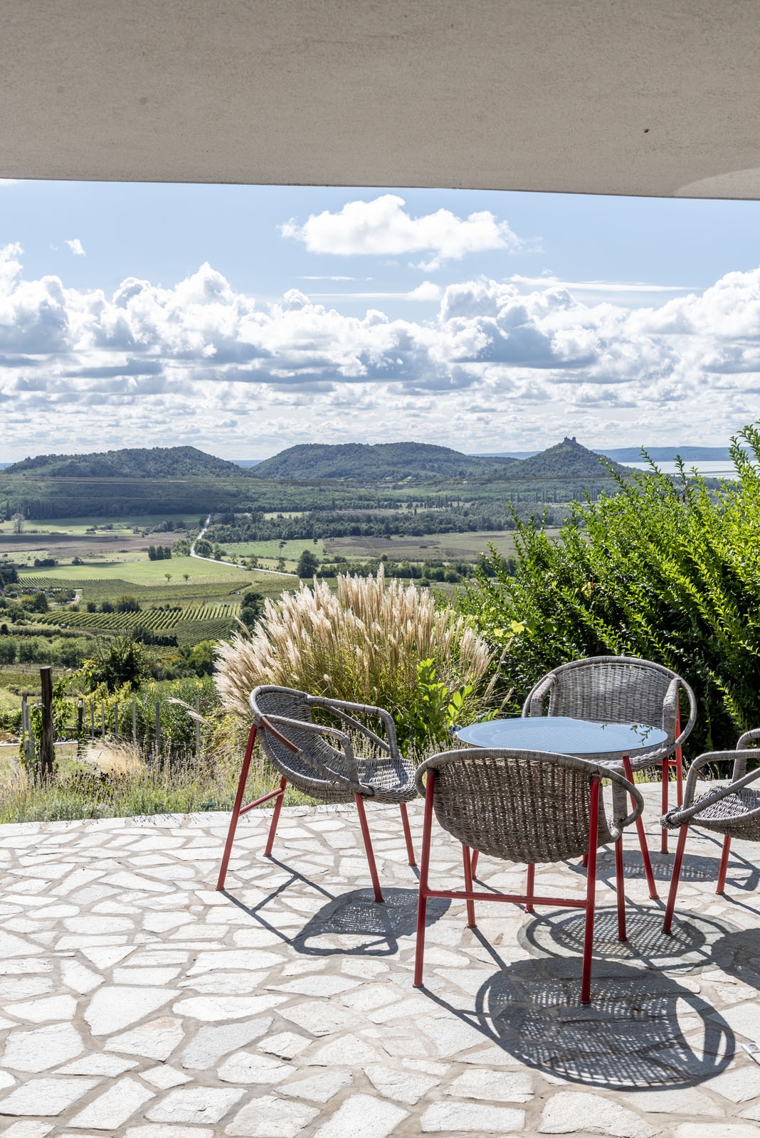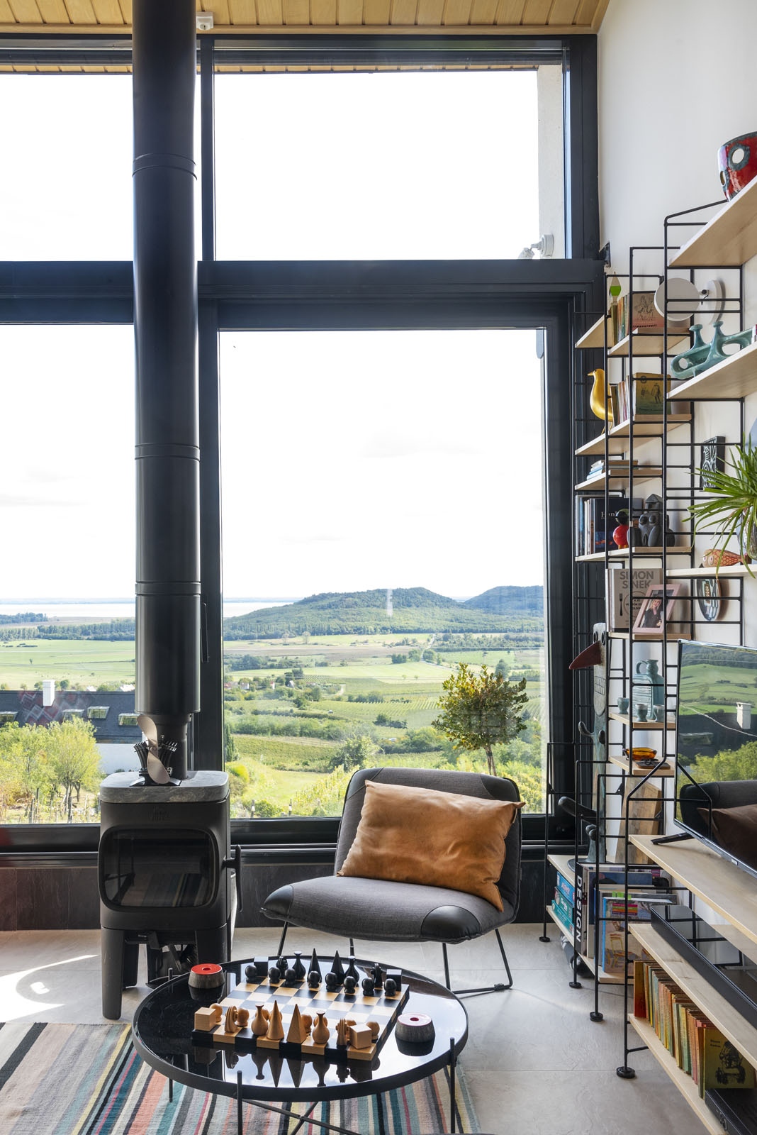 A Szent György-hegy összképéből pontosan annyira lóg ki ez a különleges formájú, igényesen felújított, ikonikus designbútorokkal és antik kincsekkel berendezett házikó, mint az előtte sorakozó kiviültetvény a Balaton-felvidéki táj szőlőinek sorából.