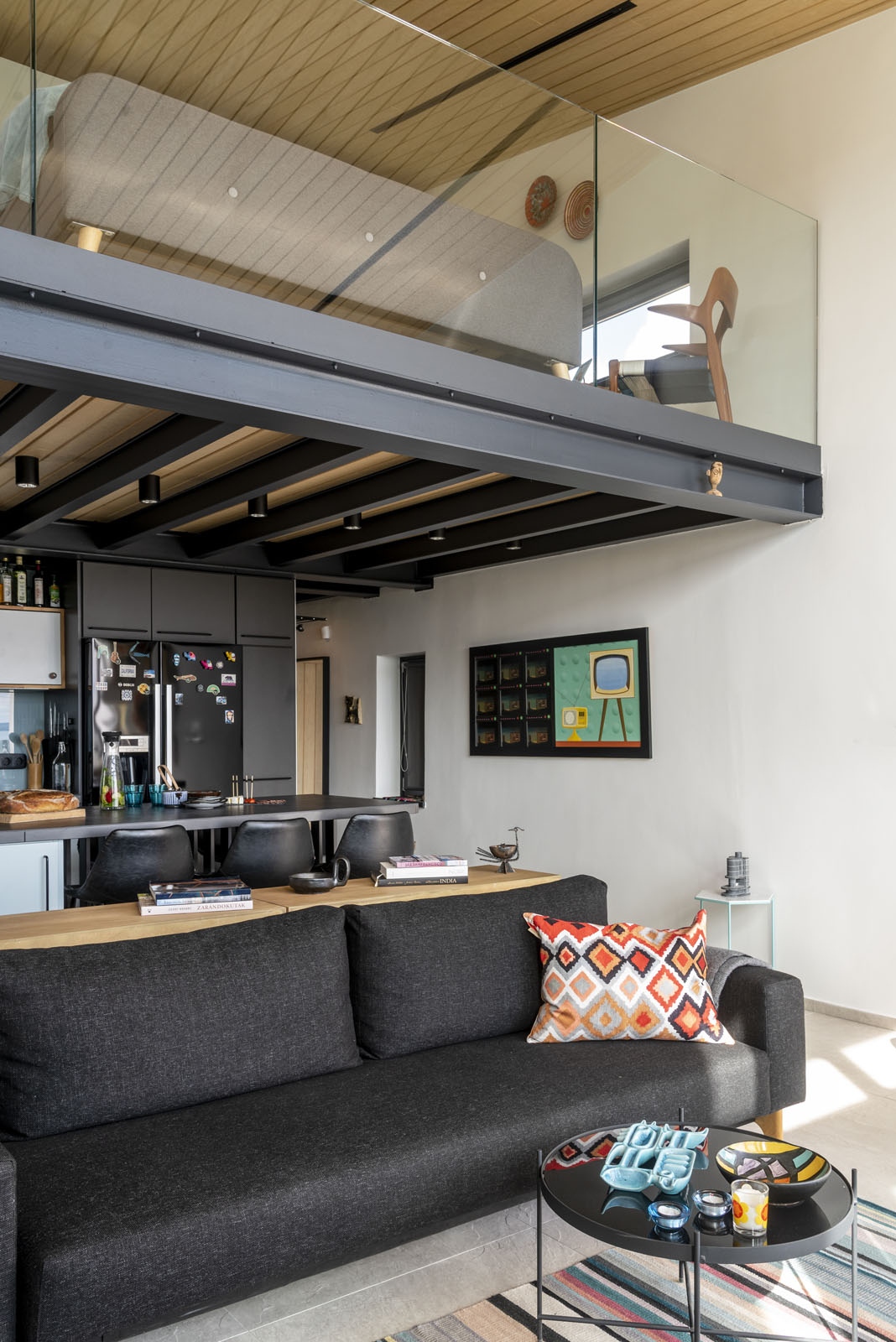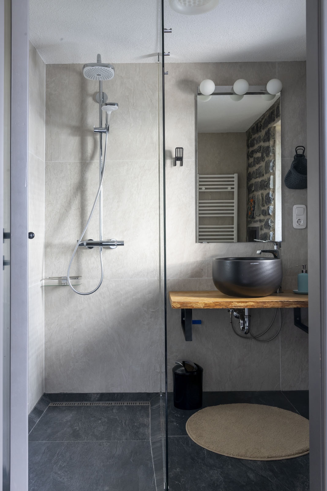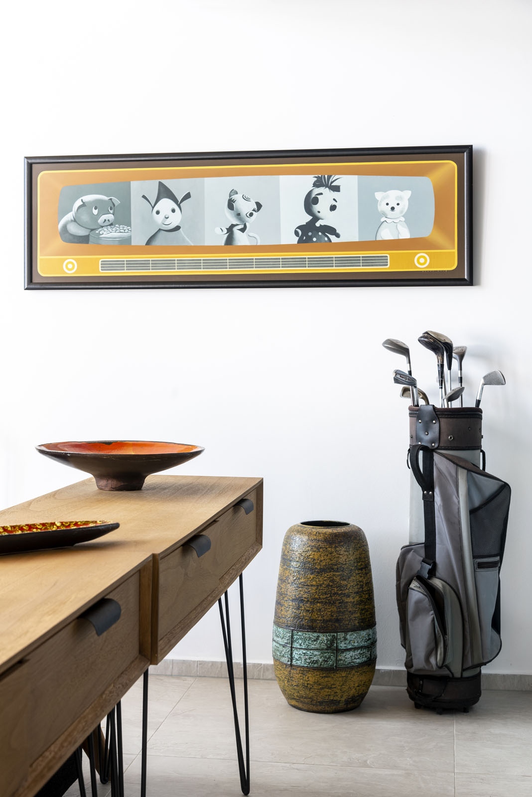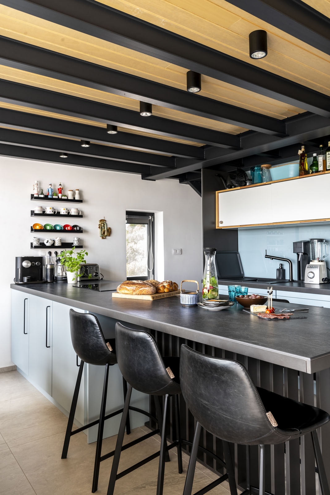 A hely – pontosabban a hegy – szellemében a ház lábazatán alkalmazott bazaltkövek díszítőelemként a ház belső tereiben is megjelennek. A tulajdonos eredeti szakmája és jelenlegi hobbija révén kifinomult ízléssel megkomponált, eklektikus belső tereket alkotott, rengeteg ikonikus design bútorral és dísztárggyal, amikhez összeválogatott antik, retró és mid century kiegészítőket társított.