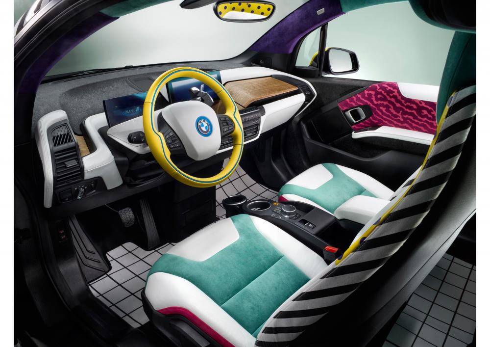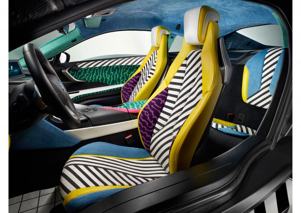 A BMW i divízió és az olaszországi Garage Italia Customs dizájnműhely legújabb különkiadásában a ferde, a vízszintes és a függőleges vonalak váltakozása hipnotikus mintázatok képében, élénk színekkel kel életre. Az éles felületek alkotta kontraszt a hagyományokkal szembeni lázadás és a merev szabványoktól való elrugaszkodás színtiszta kinyilatkozása. A mintázat és a forradalmi dizájn vonalvezetése mindkét autó esetében tökéletesen igazodik a karosszéria íveihez, a látványos fényezés azonban nem kevesebb, mint ötheti intenzív munkát emésztett fel. A dizájnerek a tervezett mintázatok élethű leképezése érdekében mindkét autón nyolcrétegnyi maszkolást alkalmaztak, és mindegyik réteg között összetett fényezési eljárással vitték fel a színeket és az árnyalatokat. A Memphis Design Group úttörő, kísérletező dizájn-filozófiája azonban nem csupán a karosszérián, de az utastér összes elemén visszaköszön, a fényezett elemeket pedig műszövetből, Alcantarából és Foglizzo bőrből készült kárpit hozza kontrasztba. A látványos mintázatokat igazi színkavalkád helyezi a figyelem középpontjába, az élénk színek között elsősorban a narancssárga, a zöld, a citromsárga és a lila árnyalatok dominálnak. A ’80-as években indult művészeti dizájnnyelvezet stílusjegyei egy csapásra forradalmasították a dizájnművészet világát, a BMW i MemphisStyle dizájnkiadás elemei pedig ezt az örökséget hirdetik.