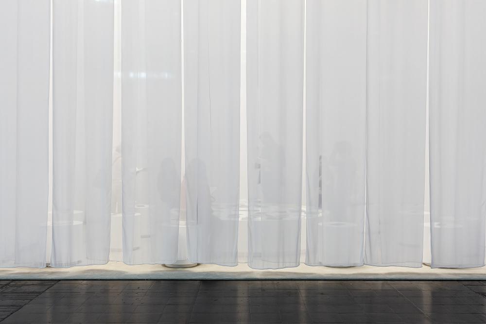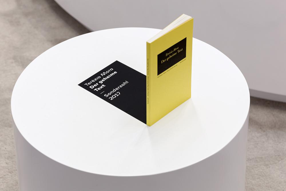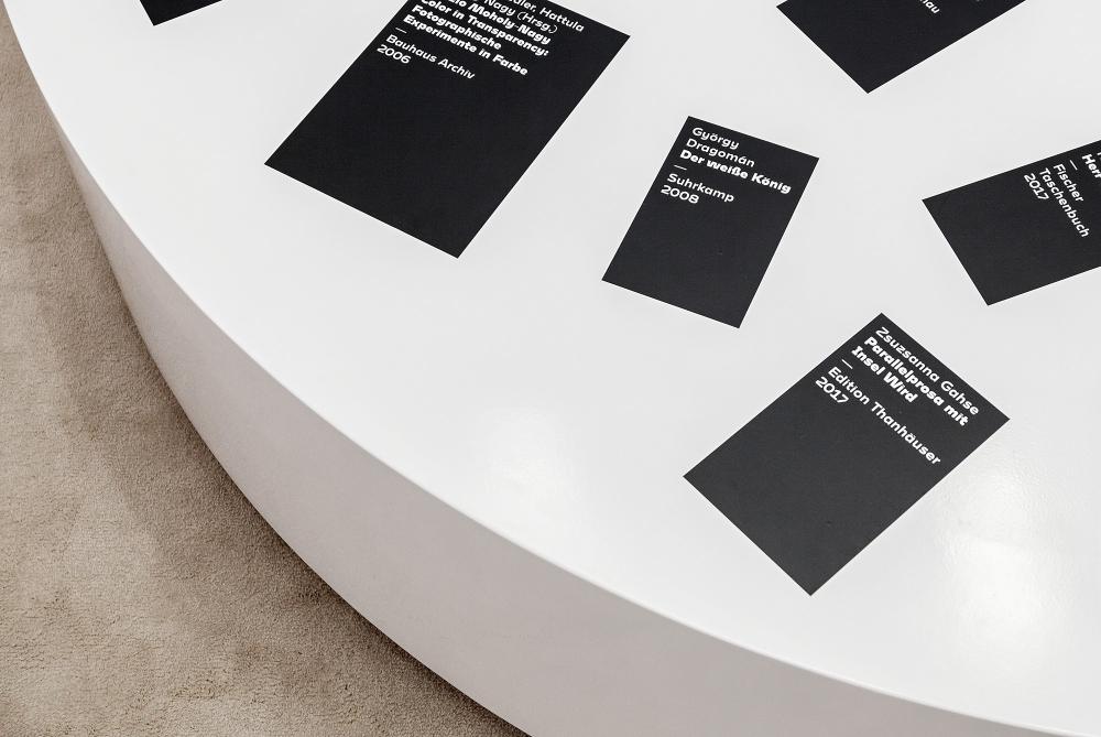Lényegében a vásári környezetre jellemző helyzetek inverzére tettünk javaslatot. A 7 méter magas, fehér, áttetsző textilfüggönyökkel bélelt, világos szőnyeggel borított térben egyedi bútorokon jelentek meg a kiállított könyvek, a speciális, e térre komponált megvilágításban. A belső téri atmoszférát – a kézenfekvő kortárs építészeti kapcsolódási pontokon túl – a Bauhaushoz kötődő, textilekkel határolt, azok mobil, könnyed, áramló tereket alkotó használatát szépen illusztráló példák is inspirálták, mint a Ludwig Mies van der Rohe és Lilly Reich tervezett „Café Samt & Seide“, amely a német selyemipar kiállítási pavilonjaként épült meg 1927-ben Berlinben. Miesnek – aki 1930-tól 1933-ig vezette a Bauhaust – ebben a tervében a használt textilanyag sajátszerűsége – annak könnyedsége, folyamatos libbenése, áttetszősége és flexibilitása – erősíti a számos tervében kikísérletezett áramló terek paradigmaváltó jelentőségű koncepcióját, melyet megidézni szerettünk volna a lipcsei kiállítási térben.