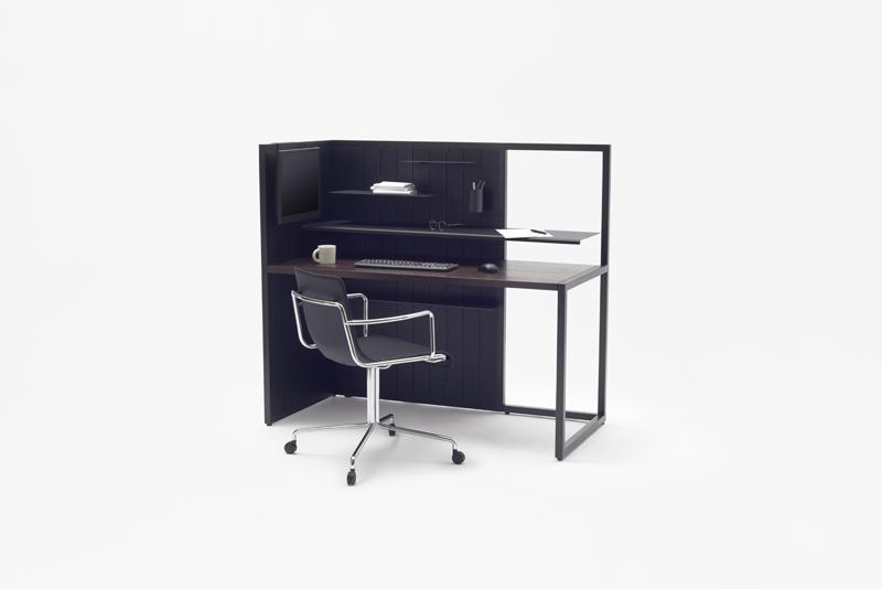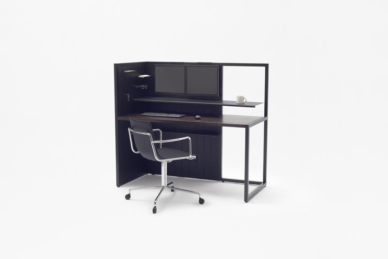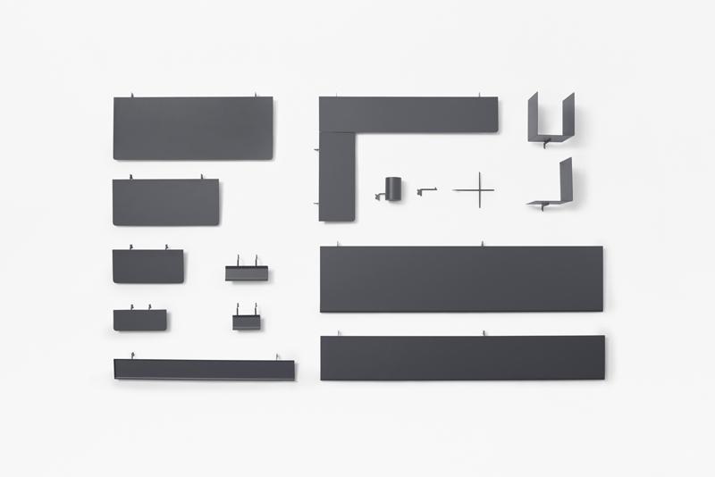 Additionally, monitors can be affixed to the partition, freeing more space on the desk. This solved the problem of managing a small space which would otherwise be taken up by two monitors on the desk, a requirement for his work and research. LED magnetic strip lights were included which can be attached anywhere at will. They serve as multipurpose lighting under the shelves, behind the partitions or as footlights under the desk. Power outlets are collected on "strip power outlets" lined up vertically in two, in front of the desk, adjacent to where Mr. Matsui sits, making it easier to charge mobile devices and power the monitors.