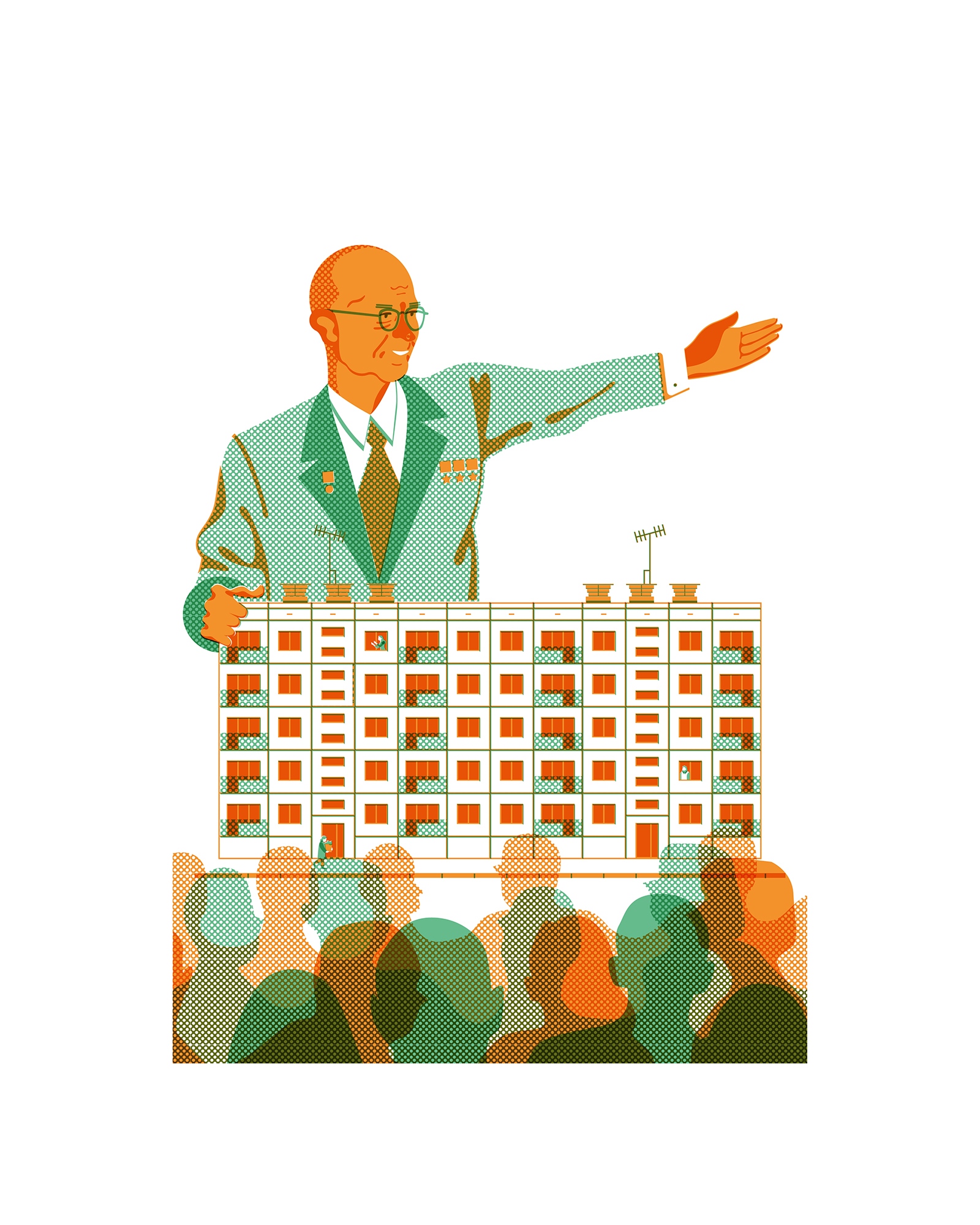 Amikor az előképekről kérdezem őket, egy szikár és alapos, inkább az építész szakmának szóló brünni kiadványt említenek, de persze, voltak előttük olyan példák is, amiktől igyekeztek távol tartani magukat, s úgy életre hívni a Jutasi olvasókönyvet, hogy az olvasmányos és felhasználóbarát legyen – mind külcsín, mind belbecs szempontjából. Az archív felvételek zömmel a Fortepan gyűjteményéből, a Veszprém Megyei Levéltárból kerültek be a kiadványba, de korabeli Lakáskultúra fotókkal is találkozhatunk. Ami pedig valóban unikálissá teszi a kötetet design szempontjából, az lehinkább Kiss Virágnak köszönhető. A grafikai tervezés és a tördelés egy percre sem hagyja unatkozni az olvasót, s a raszteres, pop-artos, de mégis nagyon is nosztalgikus (és egyszerre friss!) illusztrációk talán még a panelház-ellenesek szívét is meglágyítják.