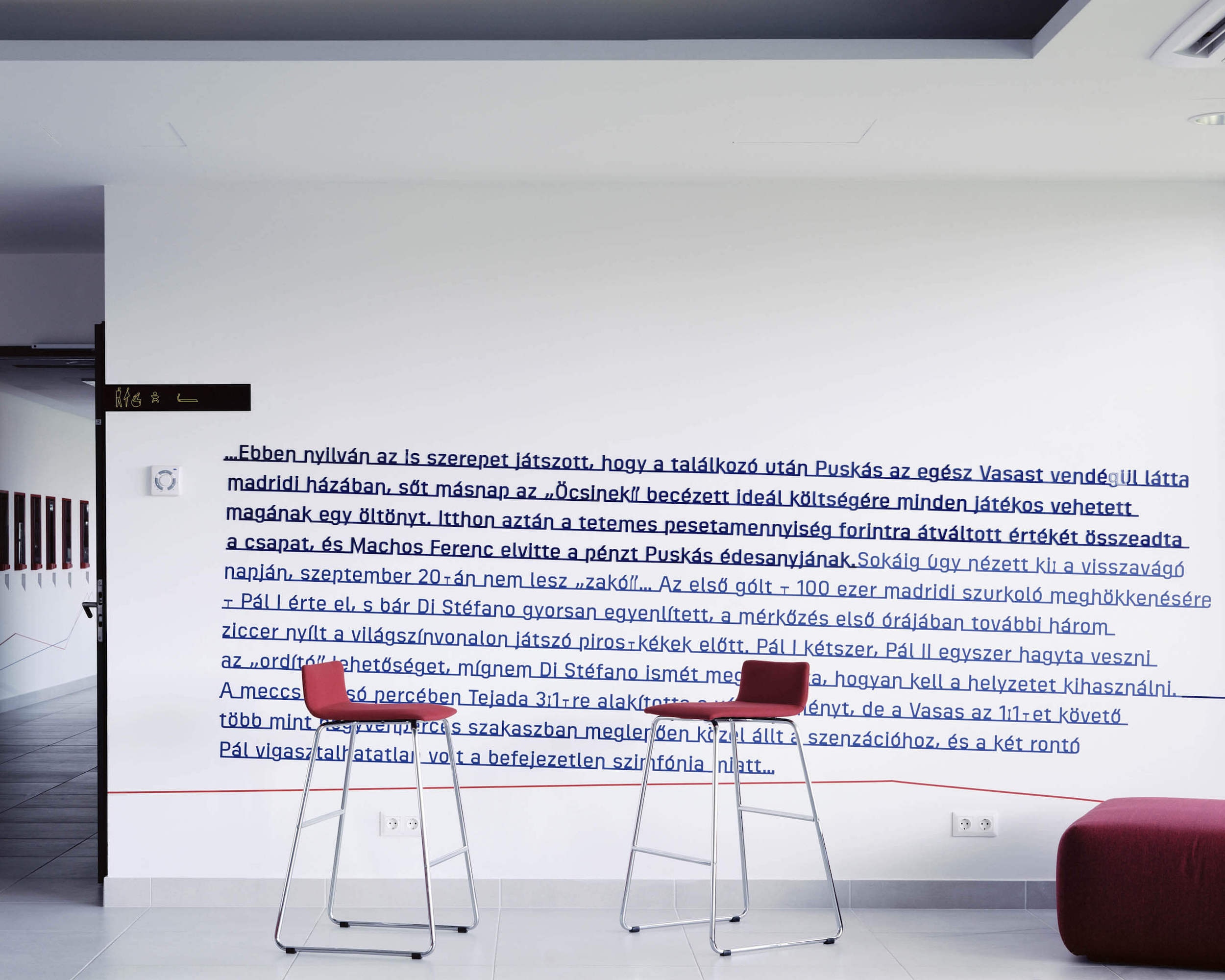 Egy stadiont számtalan típusú tér alkot, gyakorlatilag minden lelátó más és más, így egy olyan rendszert akartunk kidolgozni, amely ezen terek összességéhez igazodik. Ami a sajátosságokat illeti, az ultrák egységében grafikailag feldolgoztuk a csapathoz kötődő rigmusokat, a kedvelt sáljukat, megjelenik a gombfoci is, ami a mai napig sokak számára fontos játék, de Kassák Lajos Angyalföld című műve is helyet kap a térben, ahogy a környékbeli kocsmákat is megidéztük. Ezek mind hozzátartoznak az szurkolói identitáshoz. A családi szektort is a személyesség jellemzi. Itt a szurkolók által a kérdőívekben megfogalmazott gondolatok kaptak helyet, így ők maguk is részévé váltak a térnek.