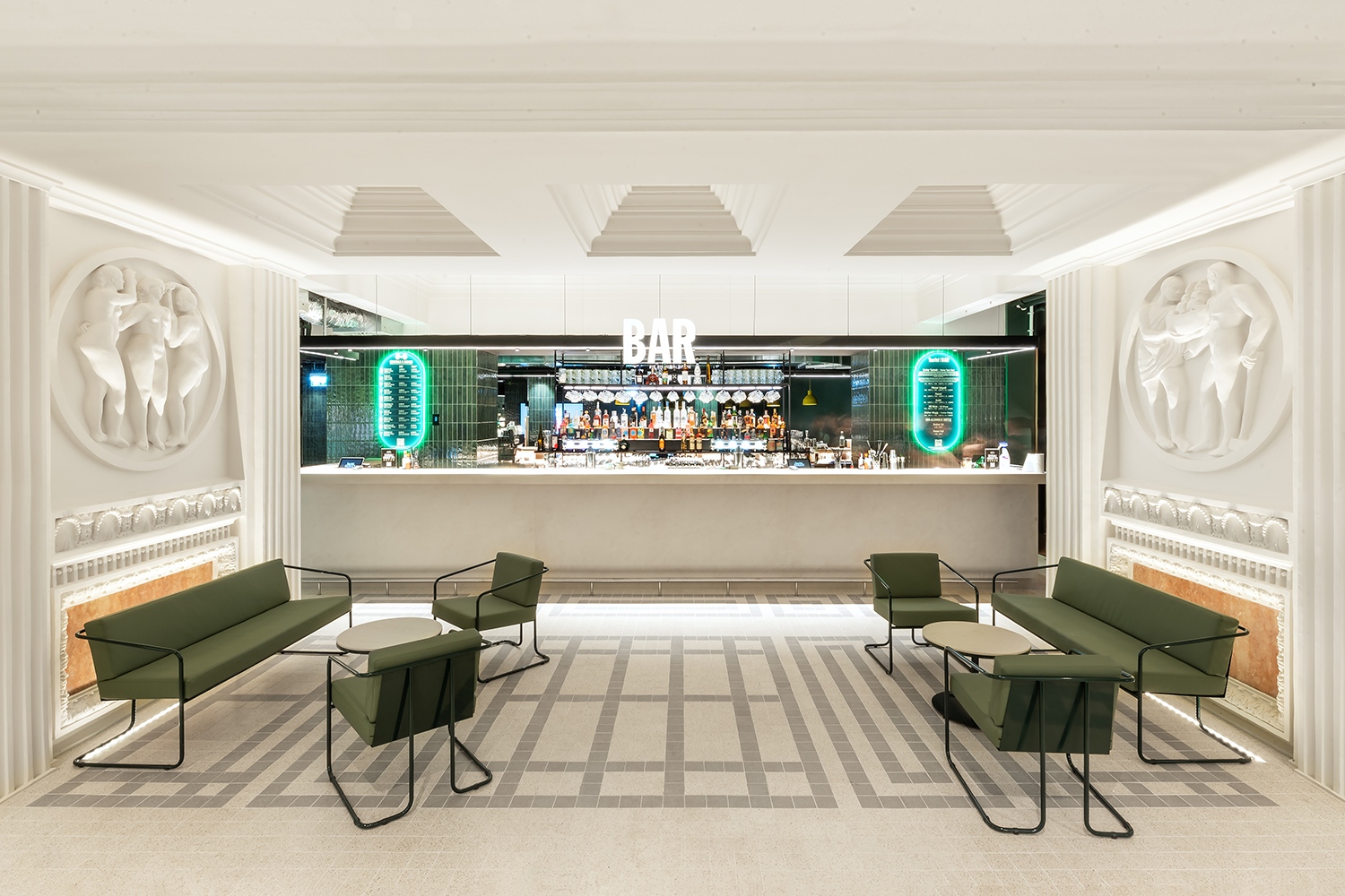 Az biztos, hogy elsőre a központi asztalsor felett alacsonynak hat a kazettás mennyezet, ám ezt a mezők közötti opálüvegek és a tervezők által meghatározott szín- és fényerőhatás valamelyest segíti. Valójában ez a galériaszintes, középen két szint belmagasságú tér teteje volt egykor, csak az 1960-as évek közepén beépítettek egy köztes új födémet, amihez már alkalmazkodni kellett napjainkra. Az eredeti térsort egyébként az Archikonnak is lett volna javaslata visszaállítani, amennyiben a profilváltás előtt csatlakoznak a projekthez. (A korábbi ütemben én a mozgólépcsővel játszottam volna bátrabban, akár egy kortárs művészeti geggel, cizelláltabb kialakítással – valamilyen design-üzenettel az ország első itt lévő mozgólépcsőjére emlékezve.) A födém maradt, de a tér magasabb lesz, ha egy kicsit felfedező útra indulunk a központi tértől a főhomlokzat felé eső traktus irányába. Itt már a kilátás is adott, ahogy a sötétebb színek is egy exkluzívabb atmoszférával lepik meg az erre merészkedőket.
