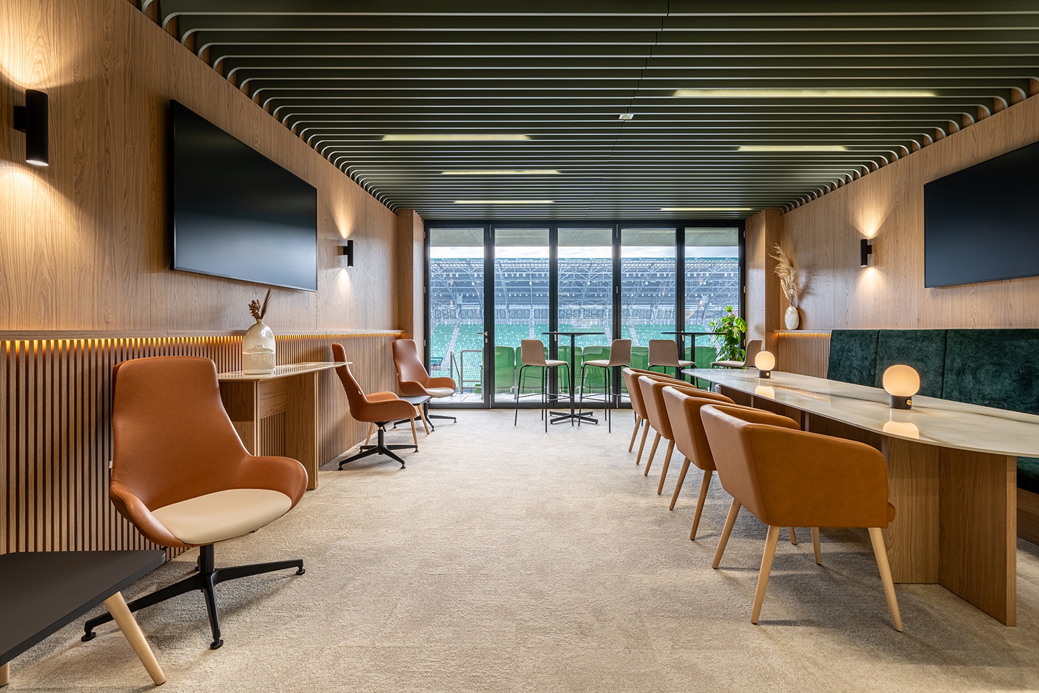 Az újragondolt Groupama Skybox egy hívogató, rugalmas és a márka arculatát tudatosan tükröző környezetet kínál használóinak. Mérkőzésnapokon exkluzív helyszínként szolgál a vendéglátás és a kapcsolatépítés számára, míg az év többi részében elegáns, jól felszerelt privát tárgyalótérként funkcionál. A legapróbb részletek – a színek és anyagok megválasztásától a világítás kialakításáig – mind azt a célt szolgálják, hogy kifejezzék a Groupama alapértékeit: a bizalmat, a minőséget és az innovációt. Ugyanakkor a tér megjelenése tiszteleg a Ferencvároshoz fűződő kapcsolat és a stadion sportkultúrája előtt is.