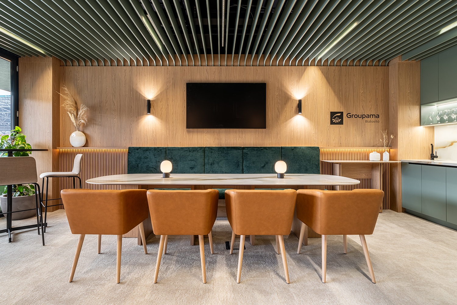 A színpaletta a Groupama és az FTC zöld árnyalataiból merített ihletet, melyet mélyebb, visszafogott tónusban alkalmaztak a kifinomult atmoszféra megteremtése érdekében. A vállalat narancssárga arculati színe inspirálta a kanapék kárpitját, valamint a márványhatású porcelán asztal és pult részleteit, finom, mégis határozott márkaazonos elemeket illesztve a térbe. Érdemes külön is felhívni a figyelmet az egyedi, akusztikus álmennyezet beépített lineáris LED-világítására, a prémium minőségű szőnyegpadlóra, valamint a falakat teljes magasságban borító speciális falburkolatokra.