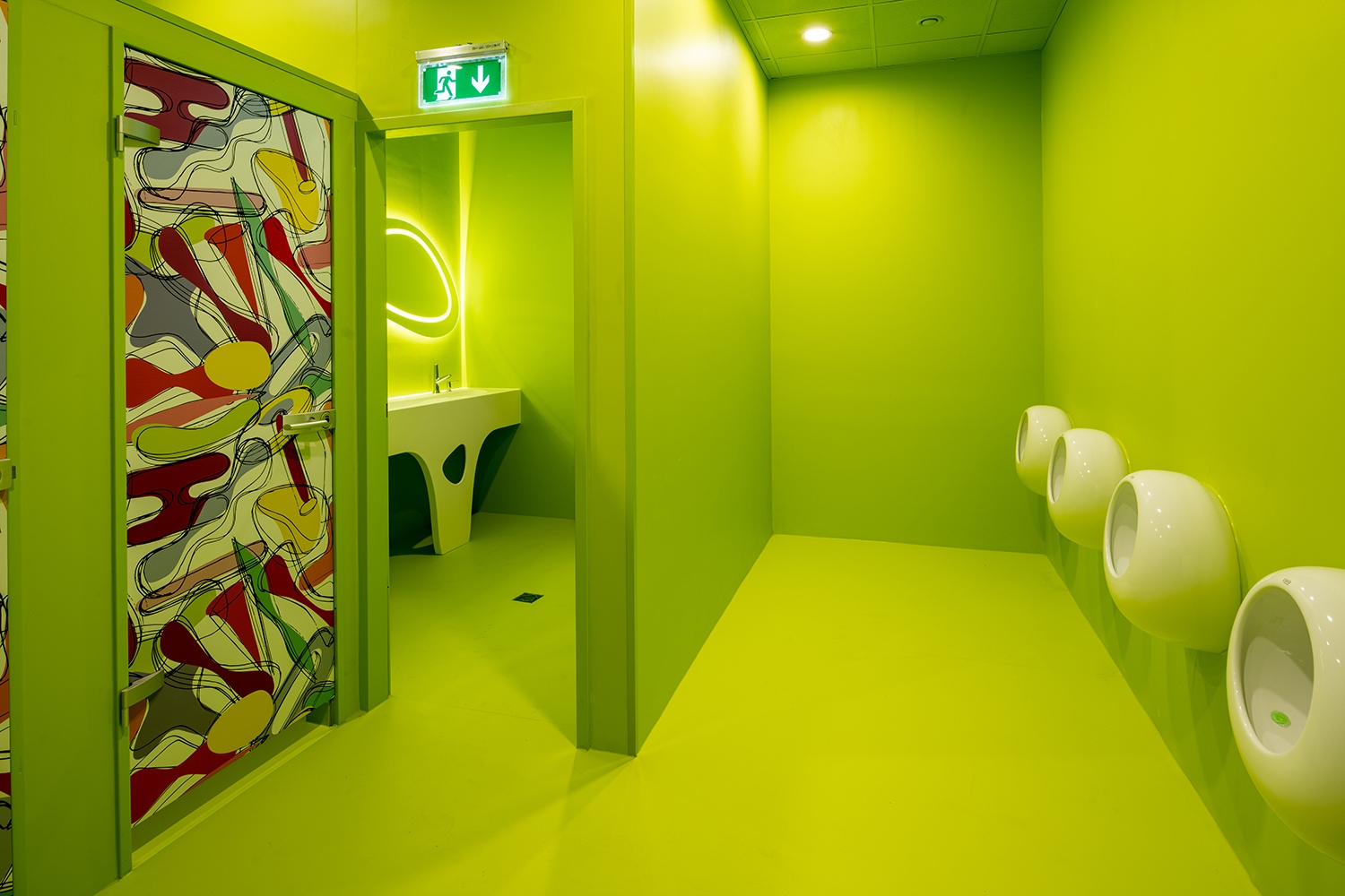 A folyosókon túl változtak a közösségi terek, a mosdók, és bekerültek a KARE x Karim kollabban fogant új lámpák is. Zsófia kiemeli a különc, narancs-szürke Kosmos kanapét, hozzátéve, hogy „minden egyes beszerzett mobilia, csaptelep olyan termék, amelyet Karim Rashid tervezett. Az, hogy egy dizájnnal foglalkozó cég egy ekkora nevet kér fel a tervezéshez, mindennél jobban mutatja az elkötelezettségünket a forma, a szépség és a lakberendezés iránt.”