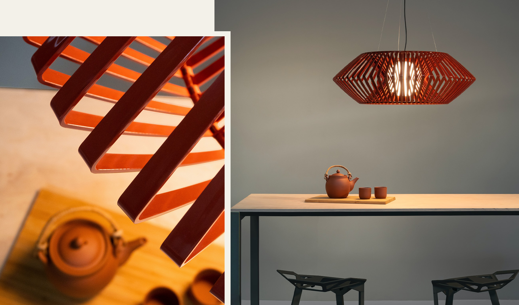 Az a by arturo alvarez V kollekciójának terrakotta darabjai igazi mediterrán hangulatot varázsolnak a szobába, a lámpabúra bordái között átszűrődő fény pedig mesés geometrikus formákat fest a falakra.
