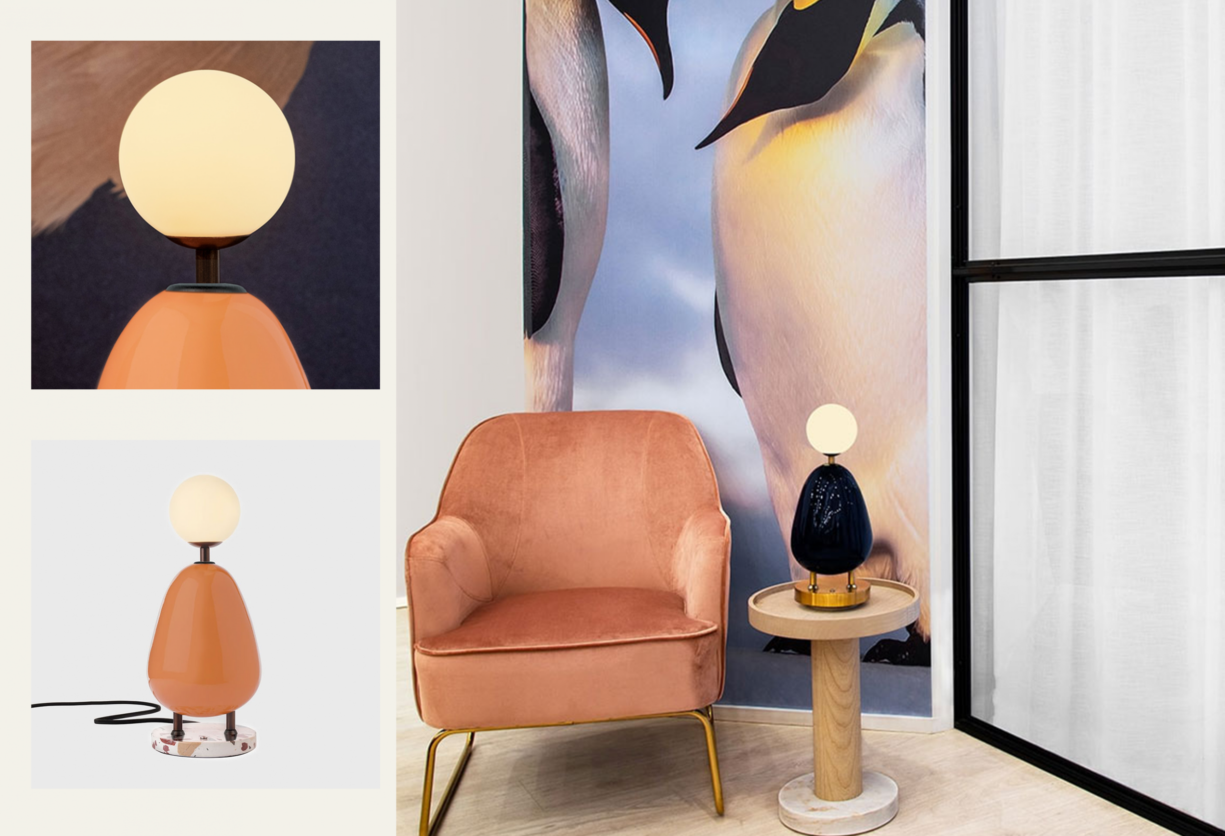 A Viso Nancie asztali lámpája az egyedi forma mellett az anyagtextúrák változatosságával is szemet gyönyörködtető: a magasfényű, festett műgyanta lámpatest, a sárgaréz vagy Terrazzo kőtalp és az opálüveg búra játékos, mégis exkluzív alakot ölt.