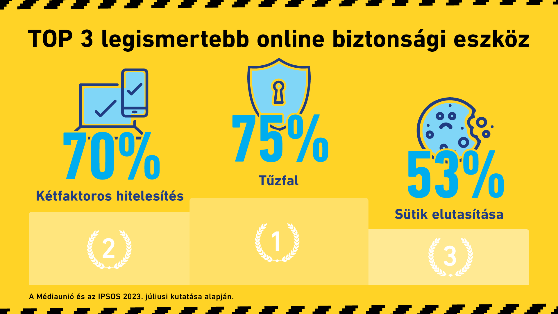Ahogy „A kulcs te vagy!” kampányhoz készült kutatásból kiderül, a felhasználók túlnyomó többsége legalább már hallott a legelterjedtebb online biztonsági eszközökről. Ismertség terén a tűzfal a listavezető: a válaszadók 75%-a ismeri ezt a személyi számítógépek hazai elterjedésével egyidőben előtérbe került eszközt – napjainkban nagyrészt az operációs rendszer beépített része, tehát csak be kell kapcsolni. A második helyezett a kétfaktoros bejelentkezés, amelyet a felhasználók 70%-a ismer, a dobogó harmadik fokát pedig a sütik elutasítása foglalja el, 53%-kal. Az eredmény első ránézésre bizakodásra ad okot, a kutatás azonban további problémákról árulkodik.