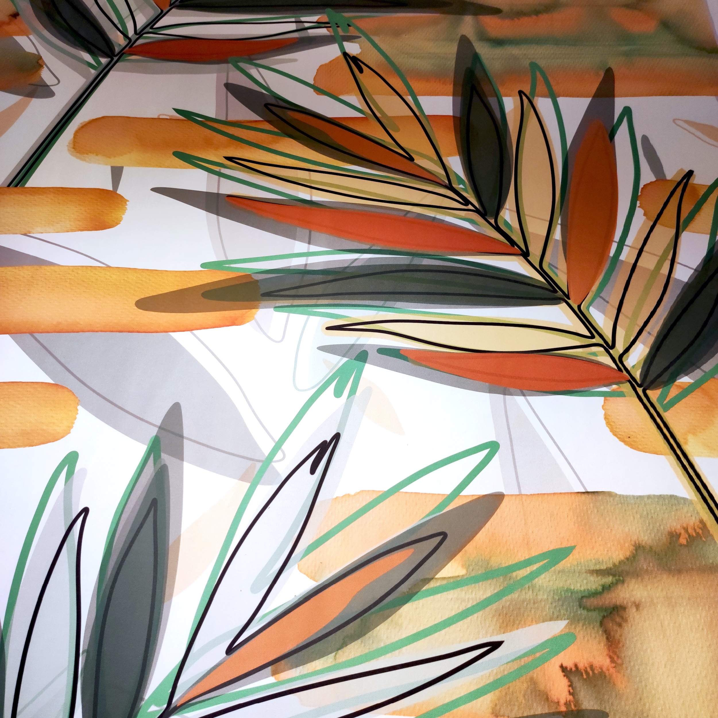A VI. TEXHIBITION kiállításon bemutatott Pálmaház megtervezésekor az inspirációt a fák levelein átszűrődő, a sárga ezer árnyalatában játszó későnyári napfény jelentette. A koncepció végső kialakítását a manuálisan, akvarelltintával megfestett felületekhez igazította, az így keletkezett sávokat és foltokat, különálló rétegként használta fel a későbbi számítógépes tervezésnél.