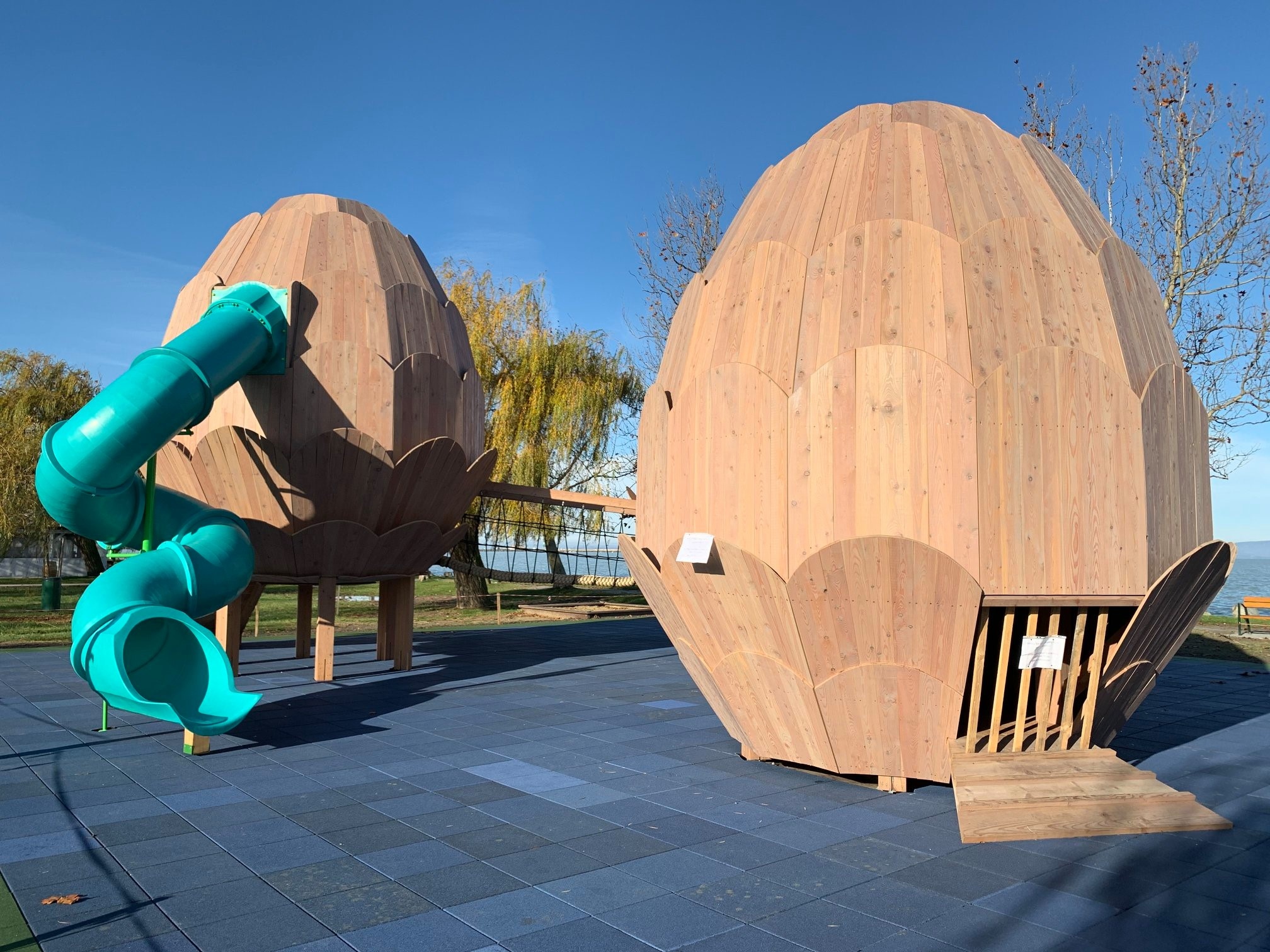 „Kedvezett az őszi napsütés a tobozoknak, és hatalmasra nőttek Balatonfenyvesen, a szabad strandon – írta a Facebook-oldalán az Ilona-malom Műhely. – A háromtornyos komplex játszóvár remek bújócska hely, egyik tobozból a másikba kötélhidakon juthatsz át, kicsi és nagy egyaránt talál csúszdát.”