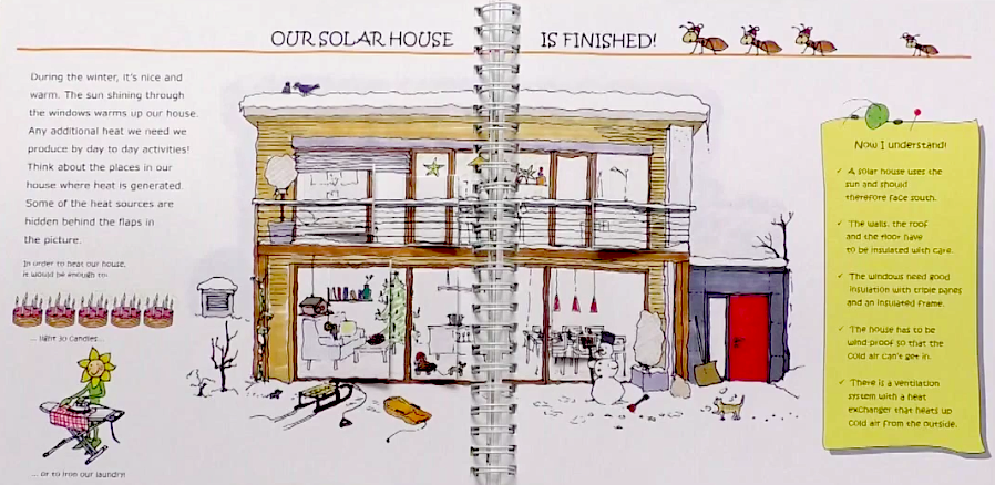 A könyvben nem röpködnek bonyolult szakkifejezések, valóban érthetően mesél a ház működéséről, mint a téli és nyári benapozást szemléltető rajzon, ahol a napocska mozgatható.