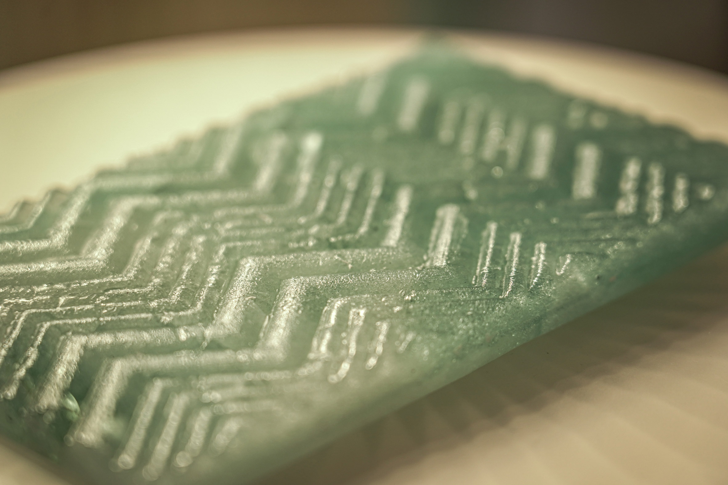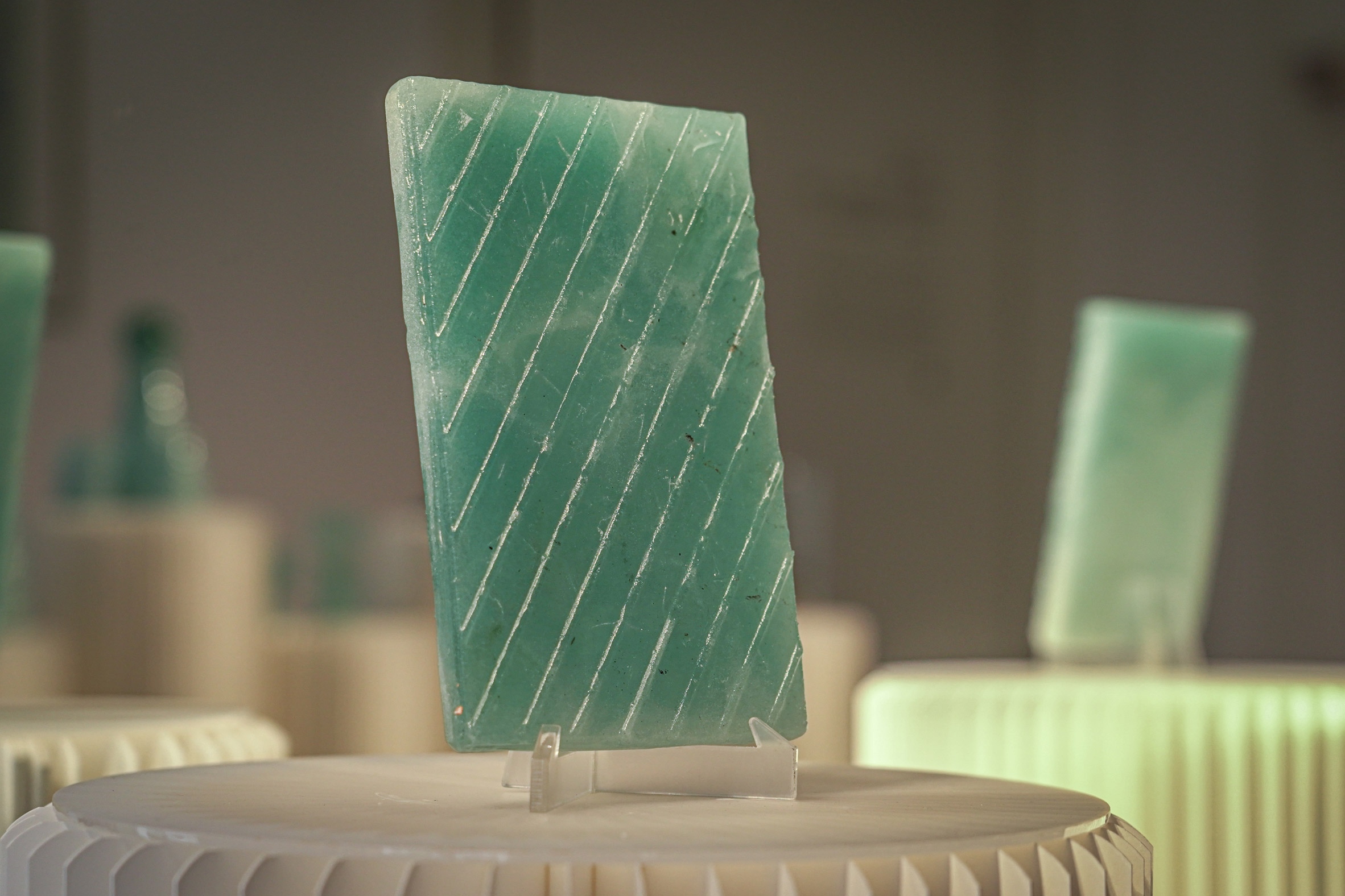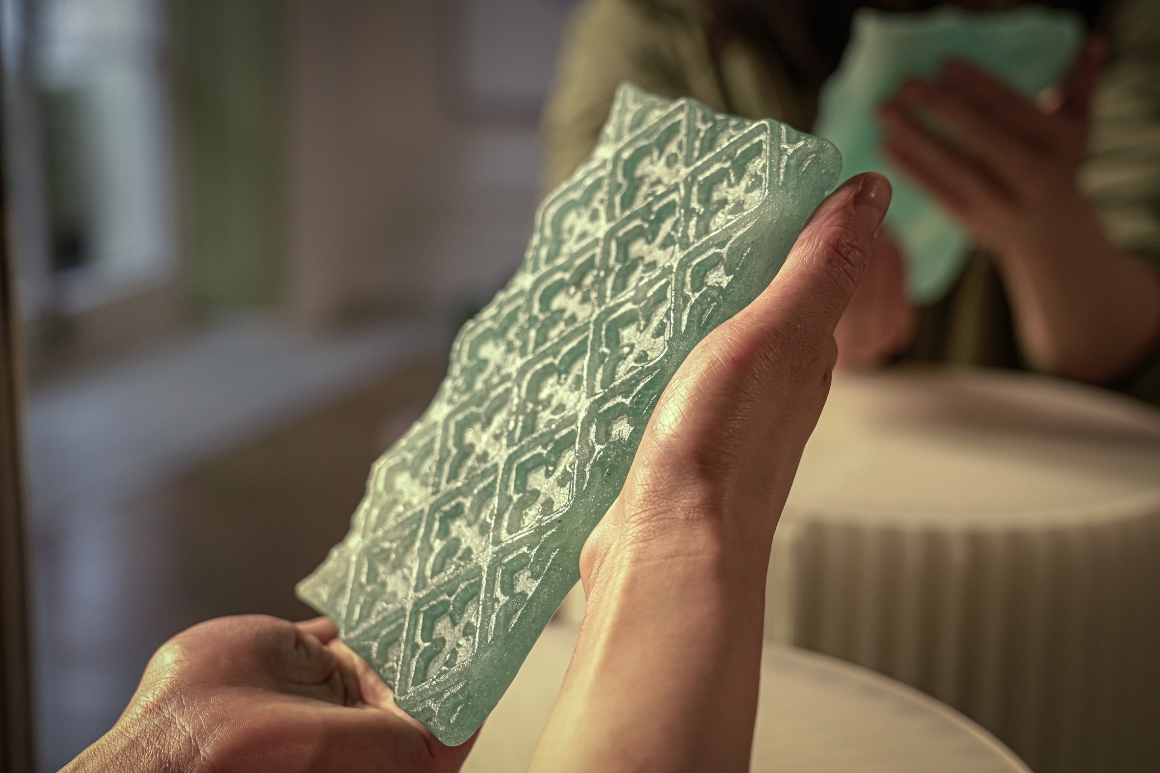 A kézzel készített bioüveg felülete természetes hatású, egyedi színű. Legelőnyösebb tulajdonságai mégis kihívást jelenthetnek a hosszútávú, széleskörű felhasználásban, hiszen az anyagminőség stabilitása bizonytalan: minden darab különböző, anyagjellemzőik nehezen vizsgálhatók, általánosíthatók. „A lapoknak megvan a saját textúrájuk, ami a fénnyel gyönyörű összhangba kerül. (…) Az anyag – szemcsésségével együtt – mélységet kap az öntési folyamat során, ami jól kiemeli viktoriánus motívumvilágát” – folytatja az ismertetést Mavropoulos.