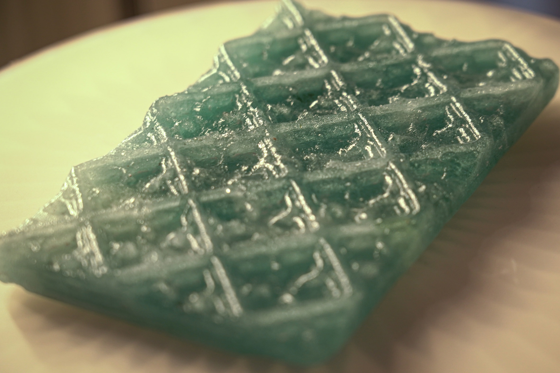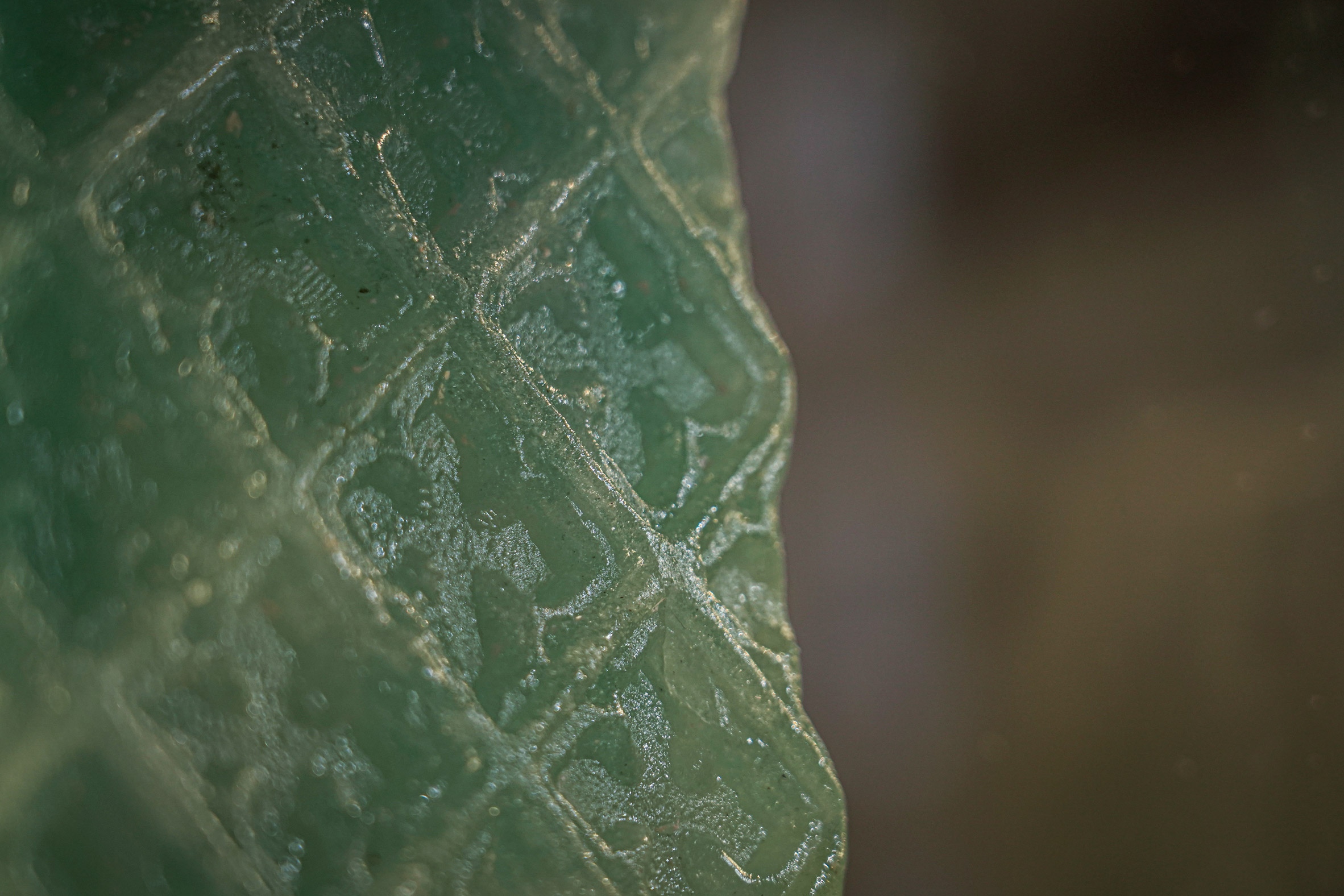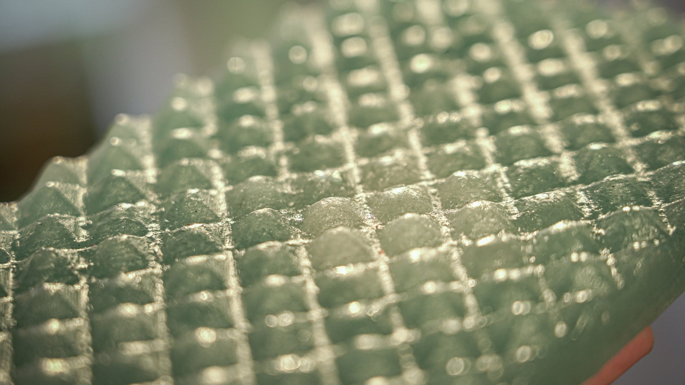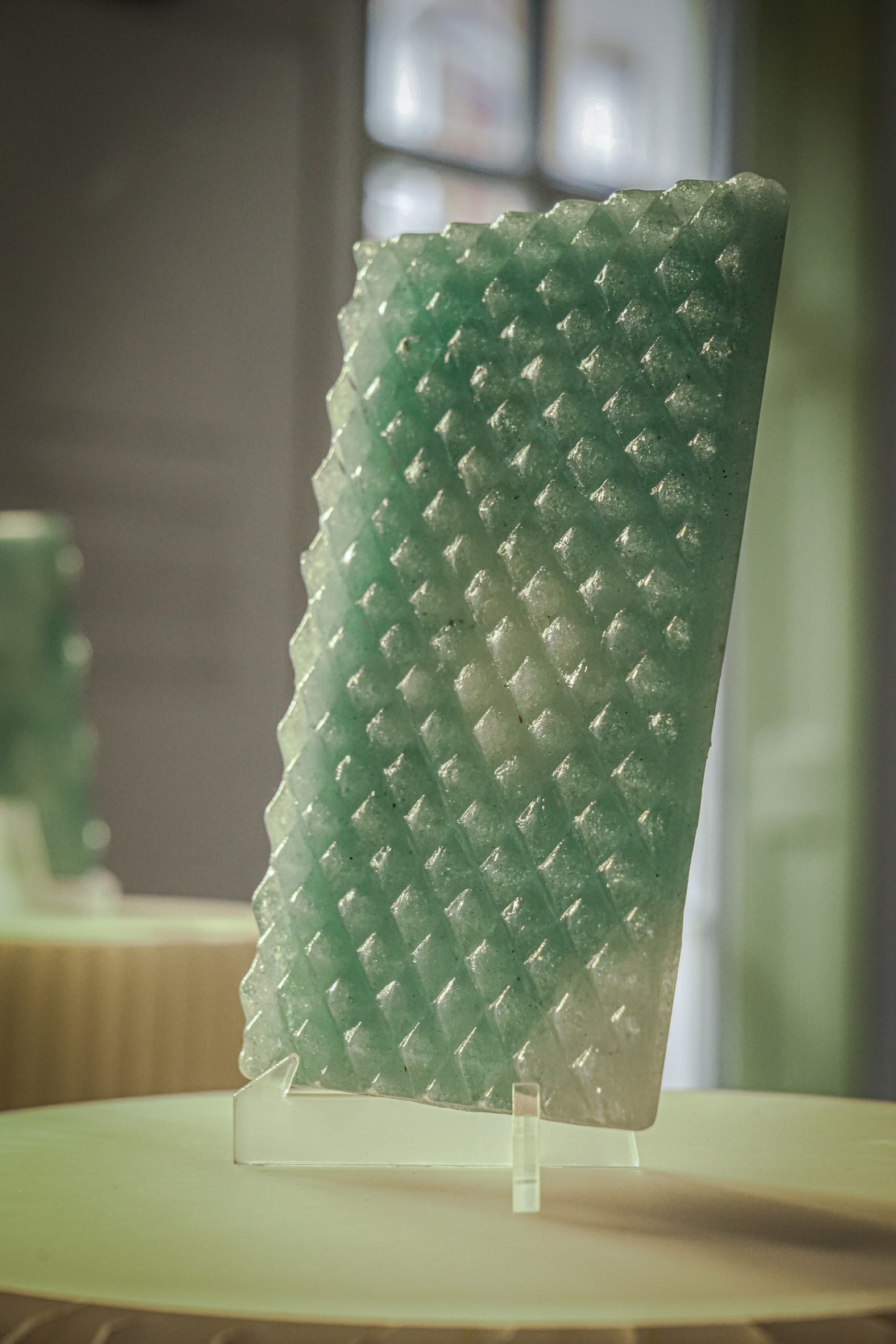 A kézzel készített bioüveg felülete természetes hatású, egyedi színű. Legelőnyösebb tulajdonságai mégis kihívást jelenthetnek a hosszútávú, széleskörű felhasználásban, hiszen az anyagminőség stabilitása bizonytalan: minden darab különböző, anyagjellemzőik nehezen vizsgálhatók, általánosíthatók. „A lapoknak megvan a saját textúrájuk, ami a fénnyel gyönyörű összhangba kerül. (…) Az anyag – szemcsésségével együtt – mélységet kap az öntési folyamat során, ami jól kiemeli viktoriánus motívumvilágát” – folytatja az ismertetést Mavropoulos.