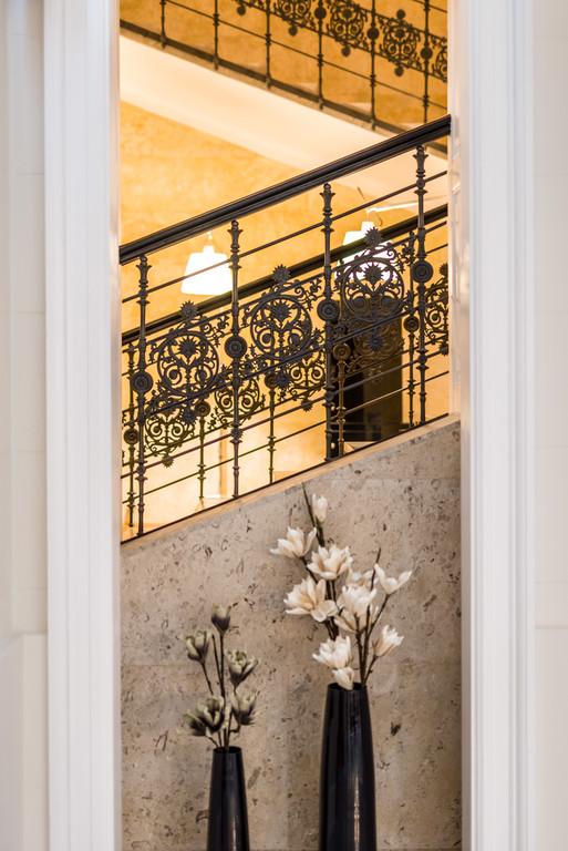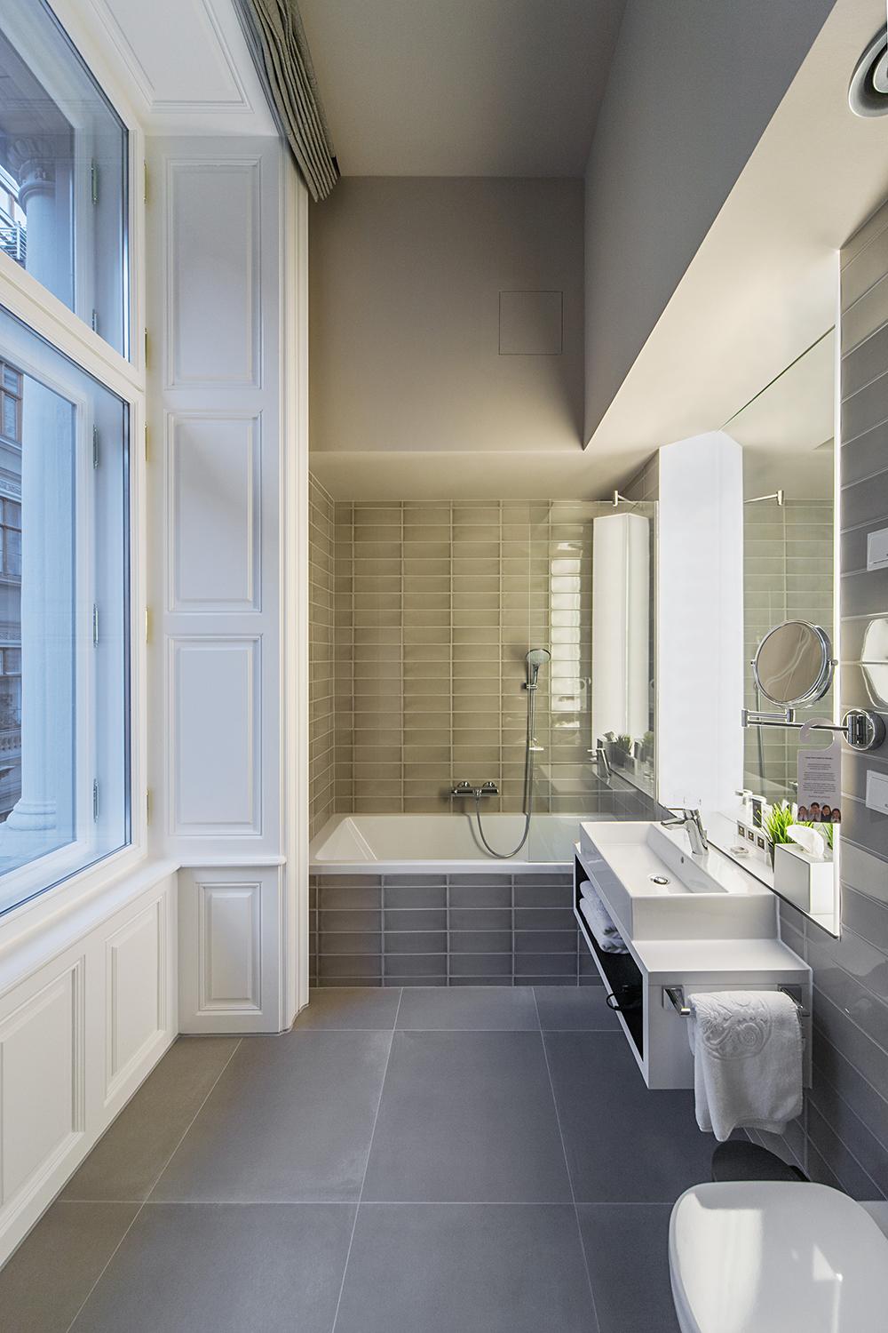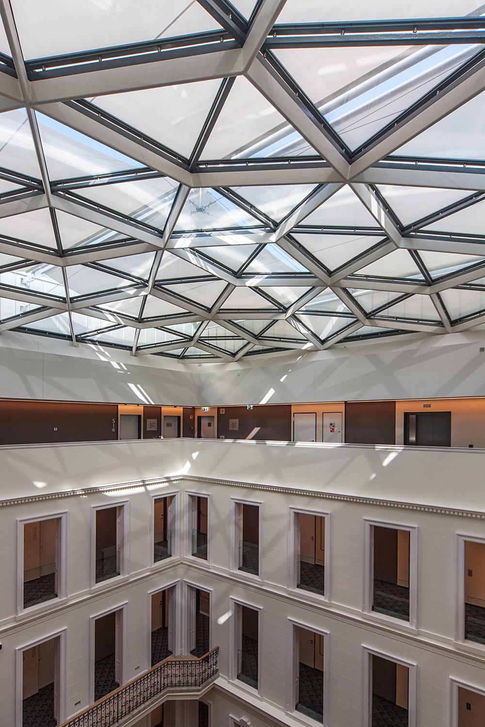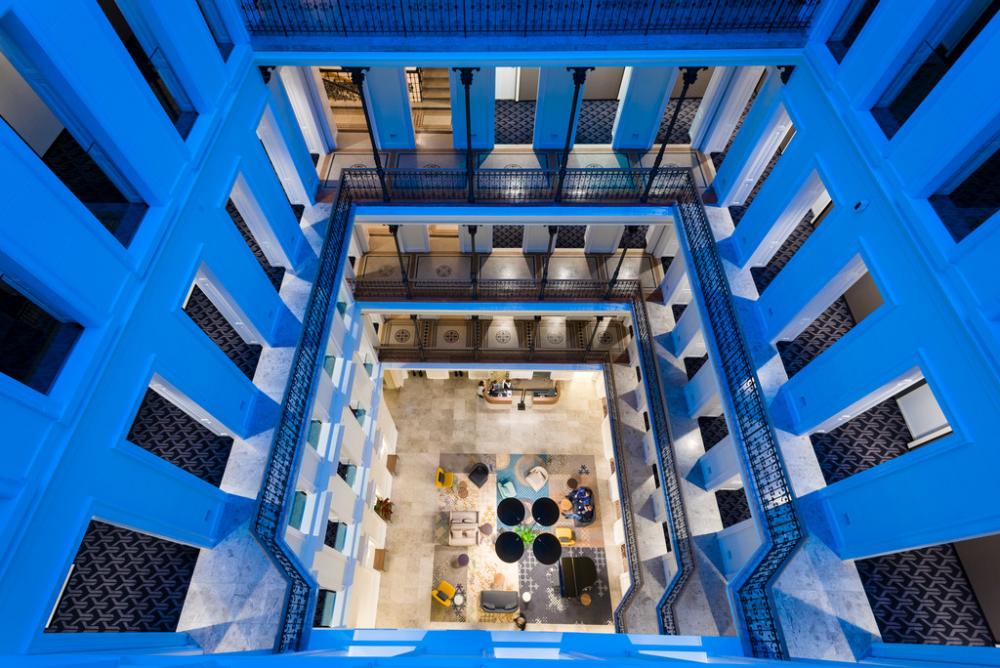 Térugrás. Nagy Csaba és Göde András közös tervezői zsenialitása több ponton is megmutatkozik. A függőfolyosó üvegfedése önmagában csak egy szellős, napfényes, de csarnokhangulatú, akusztikailag terhelt átriumot eredményezne, annak köszönhetően viszont, hogy egyedi világítótestekkel, szőnyeggel, zongorával berendezett zónát alakítottak ki a földszinten, a vertikális adottság ellenére is a belátható, horizontális térélmény dominál. A tetőszint megemelése az utcáról láthatatlan, miközben légies, üvegfalú, panorámás padlásszobák létrehozására adott lehetőséget. Már a szintén Nagy Csaba által tervezett Andrássy út 19. számú Il Bacióban is megjelent az újragondolt függőfolyosó koncepciója, a hotel esetében a kibontott ablak alatti parapetek és a nyílásokban megjelenő bélletek, valamint közös előszobává tett folyosók csalókán otthonos érzést keltenek. Arra, hogy az Archikon tetőátépítésben kiemelkedő, már a korábbi, Szabadság tér 14. számú irodaháznál példát mutatott.