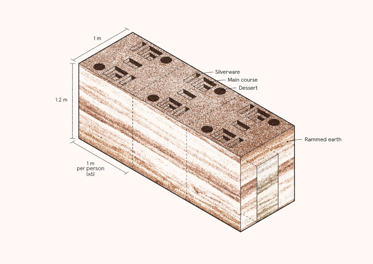 A felhívás újrahasznosítható anyagokból megépülő berendezésre szólt, de a tervezés során az iroda rájött, hogy ezen anyagok újrafeldolgozása is rengeteg hulladékkal jár, és a költségvetést is túllépték volna. Ezért forradalmi ötlettel álltak elő: az étterem közepére döngölt földből építették meg az étkezésre szolgáló bútordarabot.