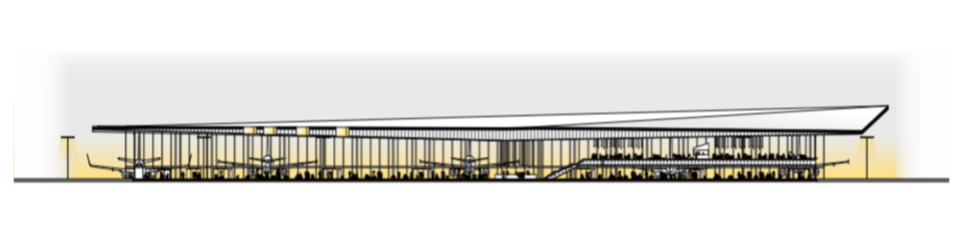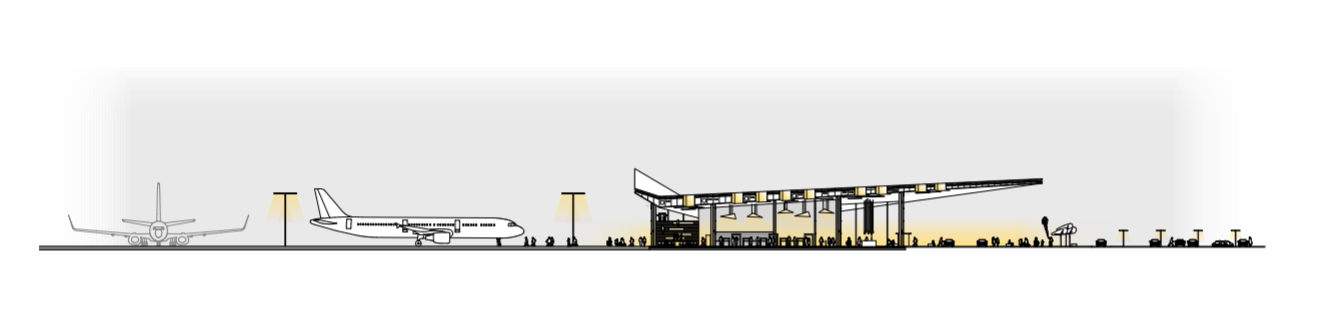 A repülőterek váróinak kavargó területe, az addig vezető utak áramlása egy sajátságos kiterebélyesedő hálózatot eredményez. Az épületben mozgó tömeg, mint energia összpontosul a várókban, a start pillanatára koncentráló versenyzőket idézve.