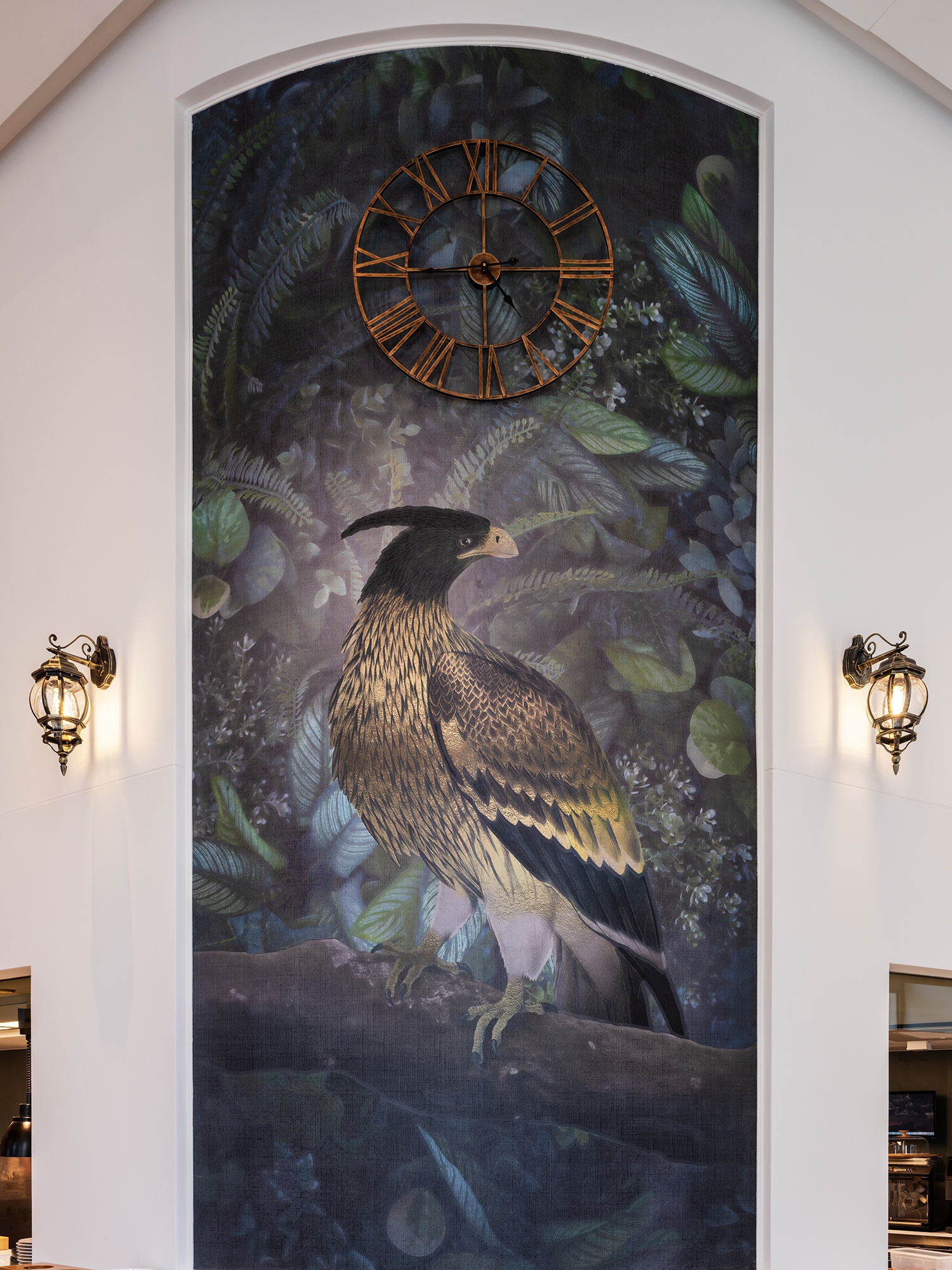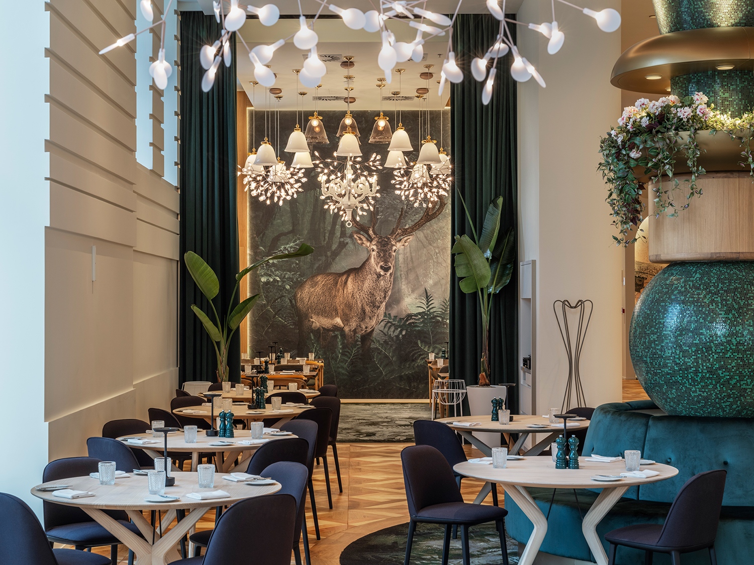 A Marcel Wanders Studio valamennyi belsőépítészeti felkérés esetében alaposan feltérképezi a tervezési helyszín tágabb és szűkebb környezetét, hogy a helyi kulturális hagyatékból kiválassza azokat a komponenseket, amelyeket aztán saját poézisével itathat át. A Kimptonban is megjelennek klasszikus wandersi elemek – mint a végtelenséget idéző tojás vagy a frivol formájú, úgynevezett „topiary” totemek –, amelyek ismétlődnek és léptékváltáson mennek keresztül. A felnagyított formák egyfajta kozmológiai gondolkodást sejtetnek – a humán létezés beágyazottságát az univerzum végtelenségébe. Ebbe a filozófiába tökéletesen illeszkedik a csodaszarvas és a turul, a magyarság két szakrális állata; a szarvas az eredet, örök megújulás és a Nap szimbóluma, a turul mint egyfajta felsőbb vezérlő erő. Melléjük emel be a tervező még egy vízi állatot, a husót – nem tudományos nevén vizát –, ami a Duna közelségét hivatott jelképezni.