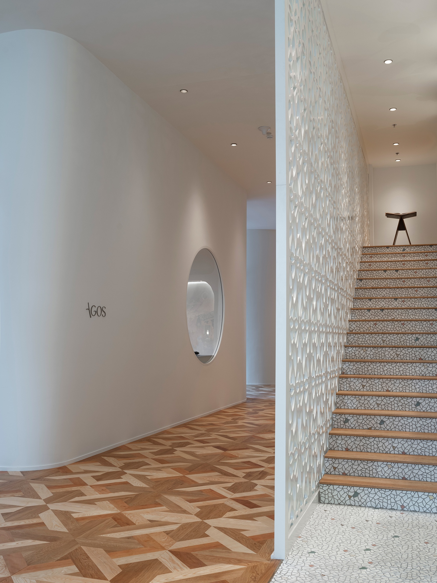 Ezt támasztja alá az is, hogy az étterem az Ágos nevet kapta, ami régiesen szólva ágas-bogast jelent. Az emelkedett elegancia ellenére az étterem alapkoncepciója közvetlen és informális. Hála a nyitott látványkonyhának, betekintést nyerhetünk a konyhai nyüzsgésbe. Szintén interakcióra sarkalló, formabontó elképzelés a hosszú asztal, amely ismeretleneket is összeboronál, és amely azáltal, hogy az üvegablak túloldalán, az étterem teraszán folytatódik, kapcsolatot teremt kül- és beltér között.