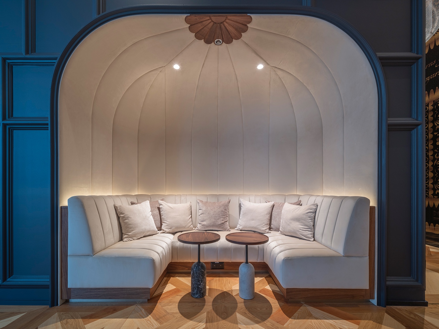 Az ívelt formájú recepciós pultok és a tojásdad könyöklők a falfülkékkel tagolt hosszanti falak mentén szimmetrikusan, egymással szemben helyezkednek el. A lobby és recepció terét kazettákkal osztott, finom stukkódíszítésű kosárív ál-dongaboltozat fedi, időtlen eleganciát kölcsönözve a térnek. A kosárívek kisebb léptékben, a falak mentén kialakított falfülkenyílásoknál megismétlődnek.