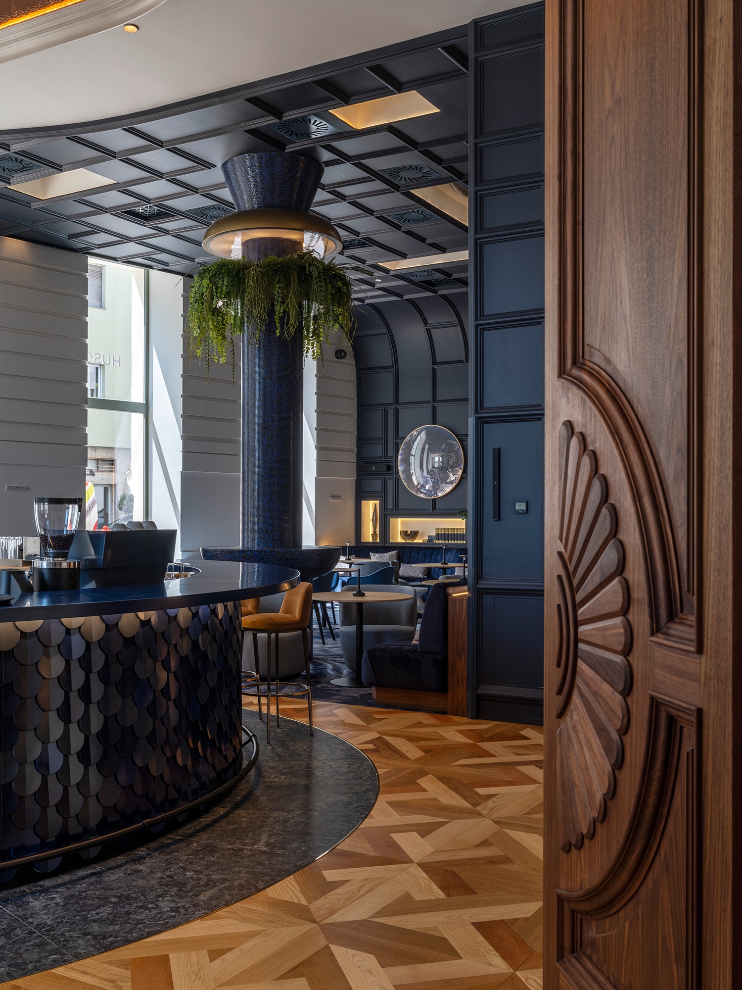 A nyilvánosság számára is látogatható bár és étterem központi elemei a baldachinként magasba törő mozaikborítású installációk. A geometrikus formákból felépülő dekoratív állványpárok gyakorlati funkciójuk mellett – beépített növényládák, ülőbútorok, pultfelületek hordozói – telítettek természetszimbolikával; a fémesen csillanó mennyezeten mint finoman fodrozódó vízfelszínen látjuk tükröződni a fatörzseket megidéző oszloppárokat. Wanders olvasatában a biofília nem a ma divatos növényfalak és beültetések formájában fejeződik ki a belső terekben, sokkal inkább eszmei-gondolati síkon.