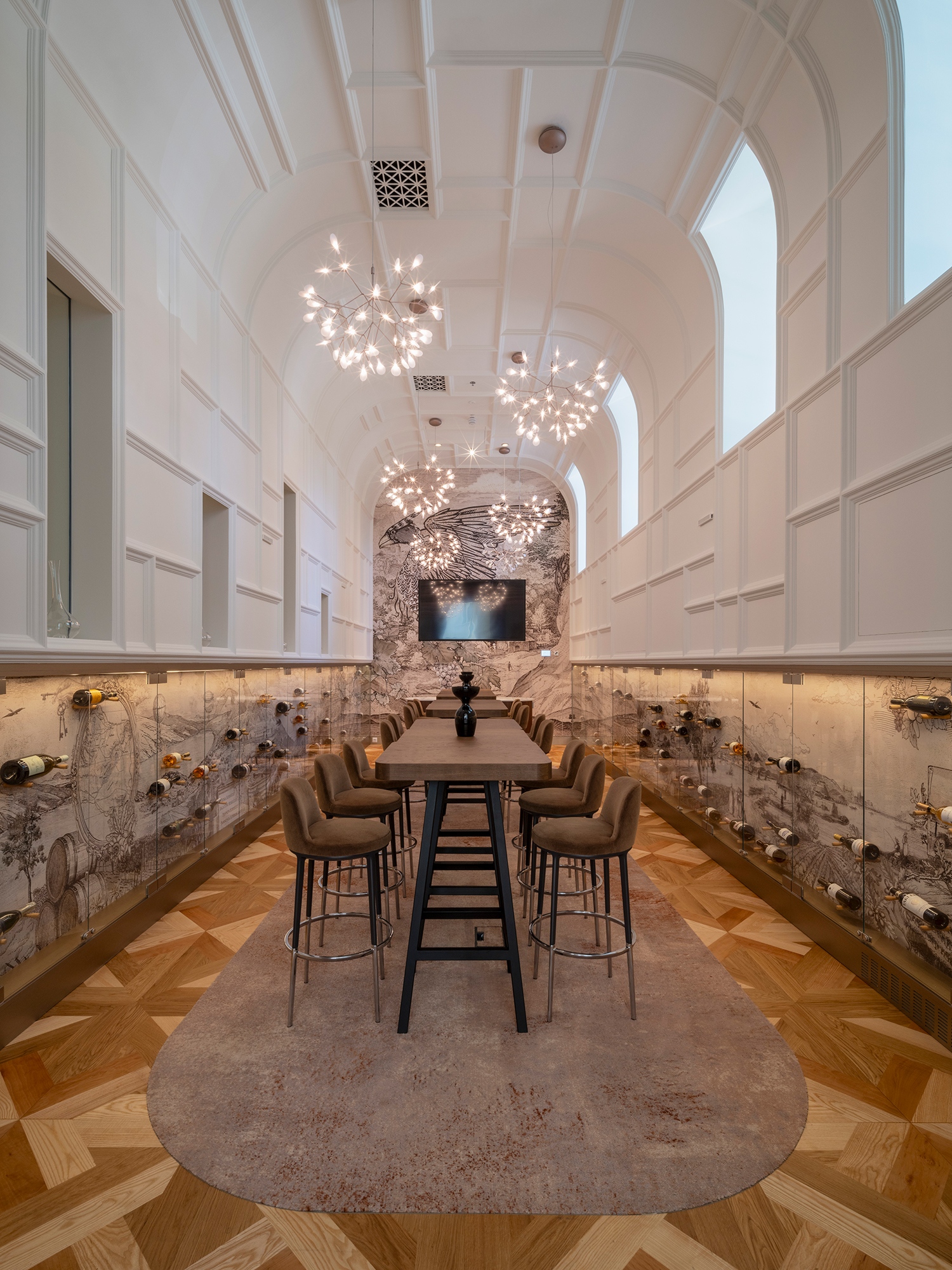 A bárból nyíló Turul chamber borkóstolók és zártkörű rendezvények helyszíne. Letisztultságával, egyszerű, natúr anyag- és színhasználatával higgadt ellenpólusa a bár mozgalmas terének. Megannyi kifinomult gondolat ölt formát a vezérmotívumok mellett is. Ezek közül kiemelnénk a lift lobbyk tapétáját, amelynek grafikája hazai könyvtárakban fellelhető antik könyvgerinceket sorol óriás méretűre nagyítva, valamint az étterembe vezető folyosóról a különhelyiségbe betekintést engedő körablak-bélletbe épített kandallóját.
