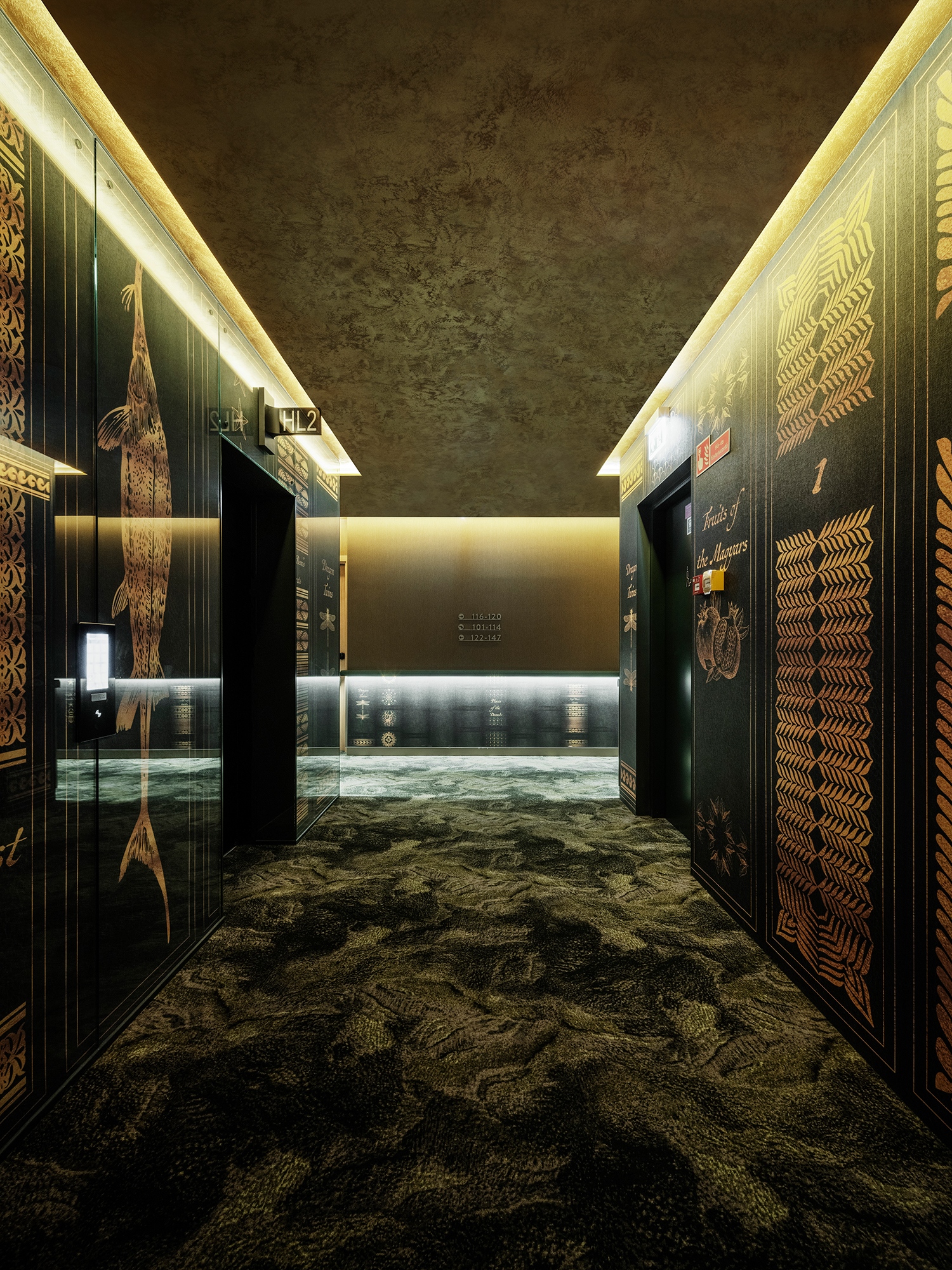 A lobby központi dísze az üvegbúra alatt elhelyezett csodaszarvas szobor. Ennek formai előképe megtalálható Wanders One minute szobrai között. Ez esetben ismét a léptékváltás eszközéhez folyamodott a tervező. A Wanders Studio által megálmodott tervekhez képest az eredetileg acélos csillogású szobor sötét felületképzést kapott, csakúgy, mint a lobbiban elhelyezett fémes pezsgőszínűre tervezett „topiary” totemek. A lobby, recepció és valamennyi földszinti közösségi tér eredetileg neutrálisabb, hidegebb hatású, a kültéri burkolattal egyező gránitpadlóját középtónusú faburkolatra cserélték a kivitelezés során. A hasonló színtónusú szőnyegeket felszippantja a padló, de főleg a Sicis mozaikokkal díszített, „Fabergé-tojás aprólékosságával kidolgozott” folklorisztikus könyöklők nem tudnak emiatt méltóképp érvényesülni.