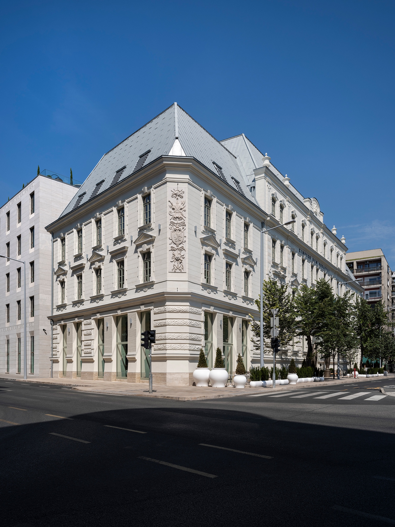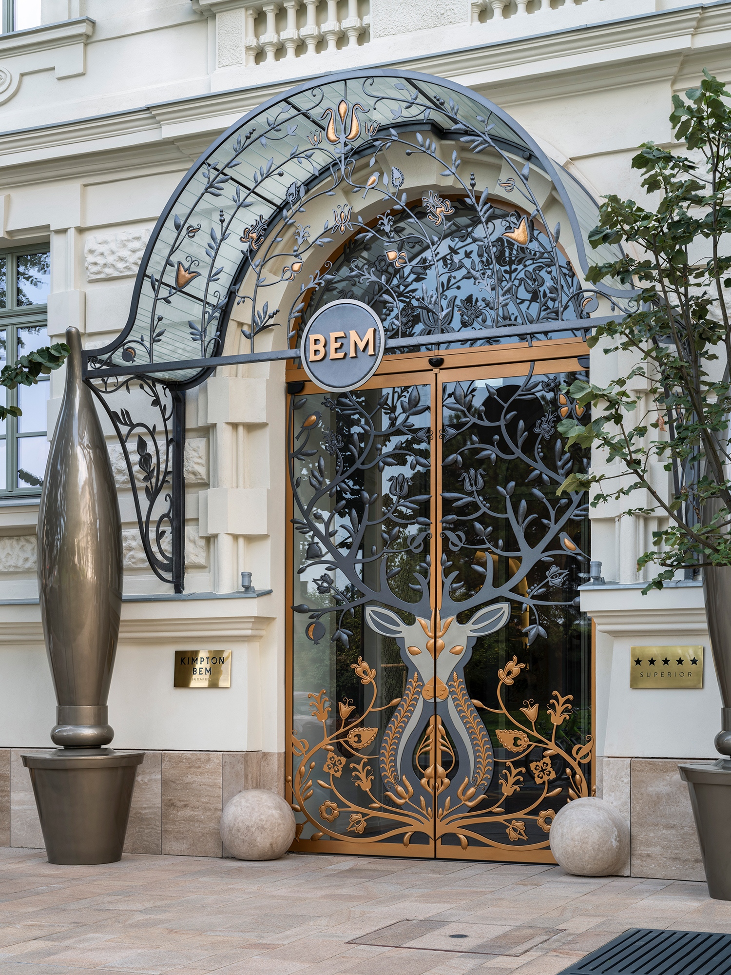 Az enteriőr meghatározó elemei a helyszínre készült egyedi grafikák és díszítőelemek. A genius loci tisztelete már belépés előtt megmutatkozik a finoman cizellált kovácsoltvas kapuzaton, amely a mitikus utalásokat és a budapesti szecesszió ornamentikáját bújtatja kortárs köntösbe. „A mi felelősségünk, hogy a lábnyom, amit magunk után hagyunk, egyszerre szóljon múltról és jelenről, valamint láthatóvá tegye azok értékeit a jövő számára” – vallja Marcel Wanders.