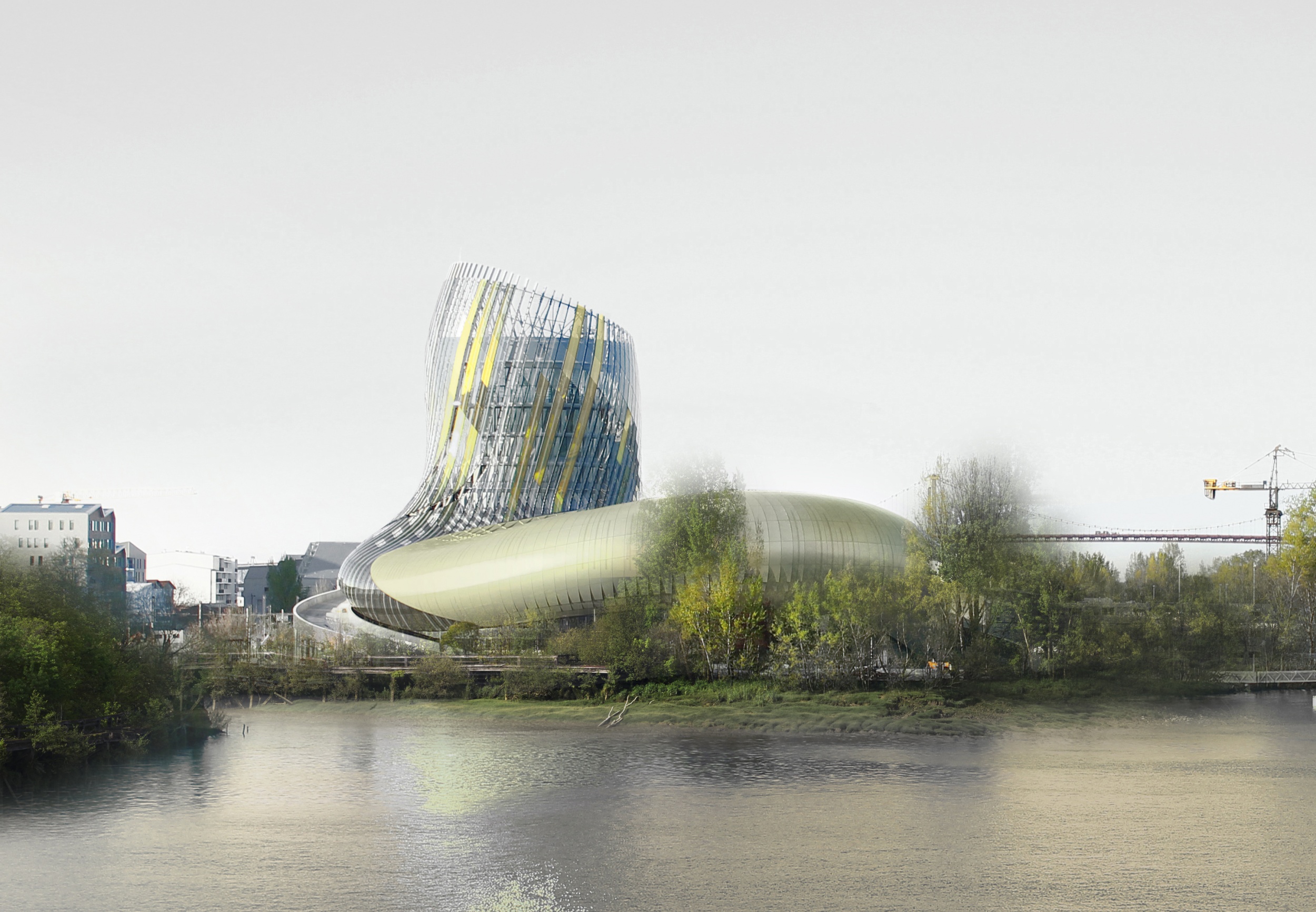A látványos épület a bor szellemiségét és halmazállapotából fakadó tulajdonságait szimbolizálja: finoman lekerekített, lágy ívek jellemzik, és a látványt áthatja az érzékiség és a megfoghatatlanság szelleme. Az egyedi és merész megjelenésű épület az XTU Architects építésziroda tervezői, Anouk Legendre és Nicolas Desmazières keze munkáját dicséri.