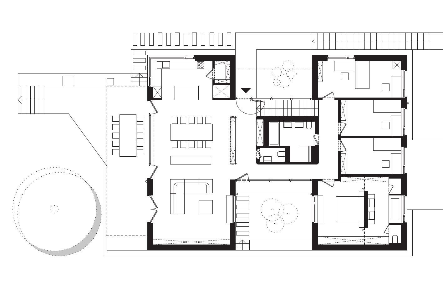 Az elválasztás azonban nem jelent elhatárolást, már a főbejárat feltárása is megmutatja. Nagy üvegfelületekkel, az átkötőtag megformálásával nyitott térrendszert hoztak létre az építészek, és akadálymentes az átlátás a ház számos terén keresztül. Méretét, alapterületét indokolja, hogy háromgyerekes család lakja, akik – ezért is az önálló tömbben elhelyezett egyterű közösségi lakórész – aktív családi, társasági életet élnek, és amikor a nagy família gyűlik itt össze, kilenc gyerek rohangál a terekben, a kertben.