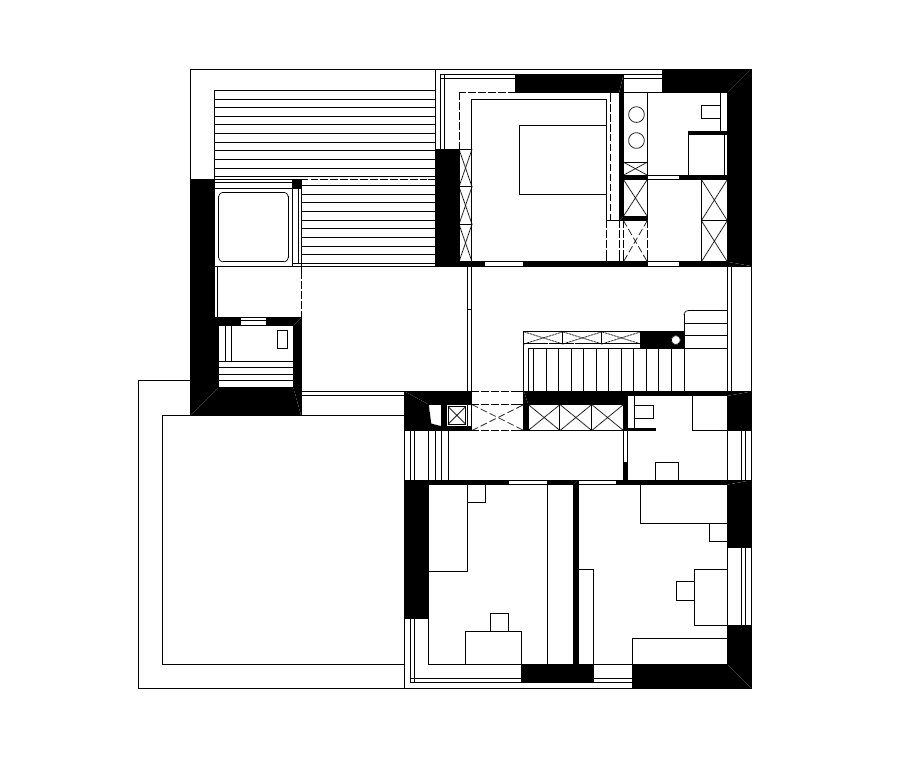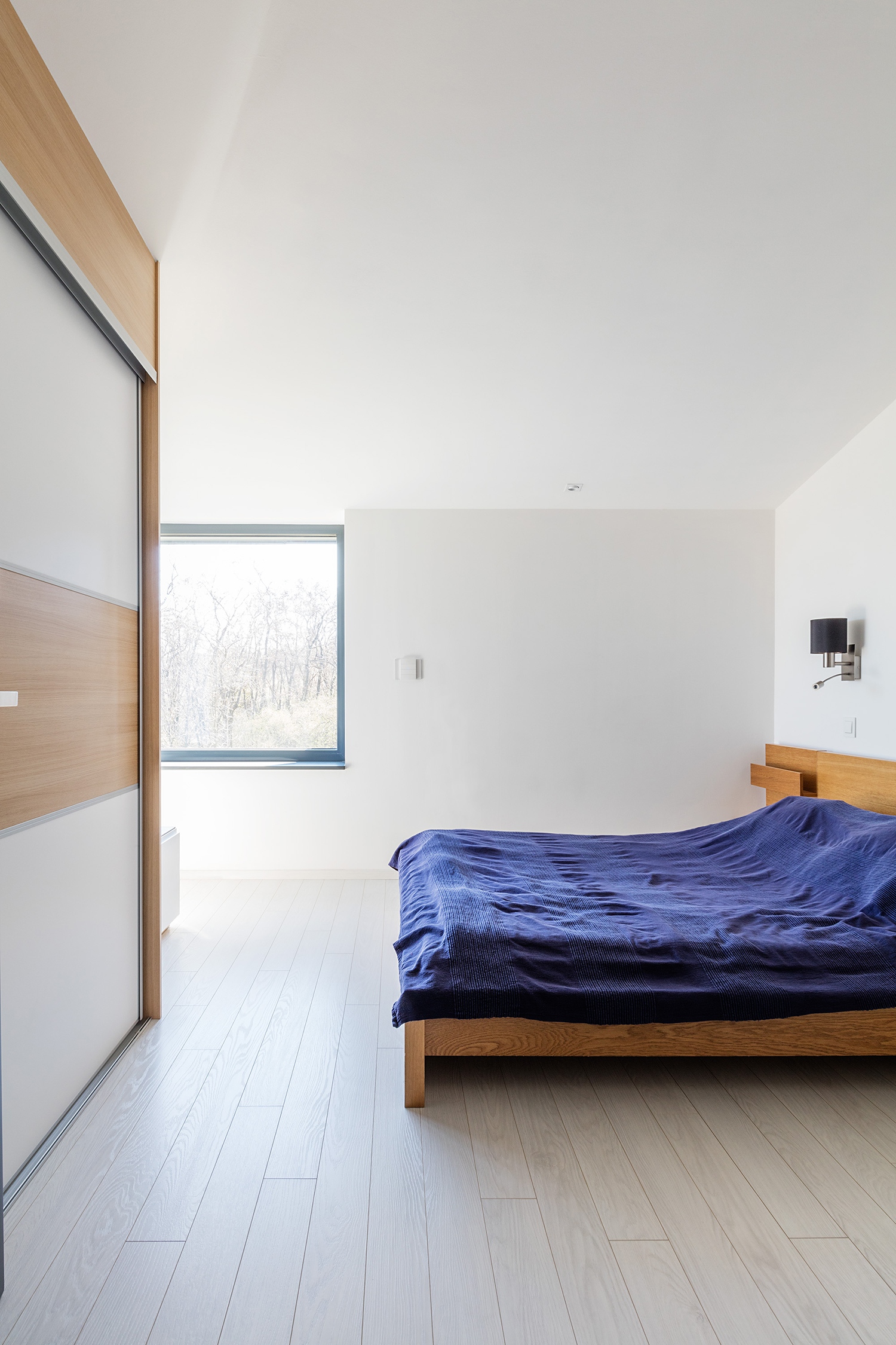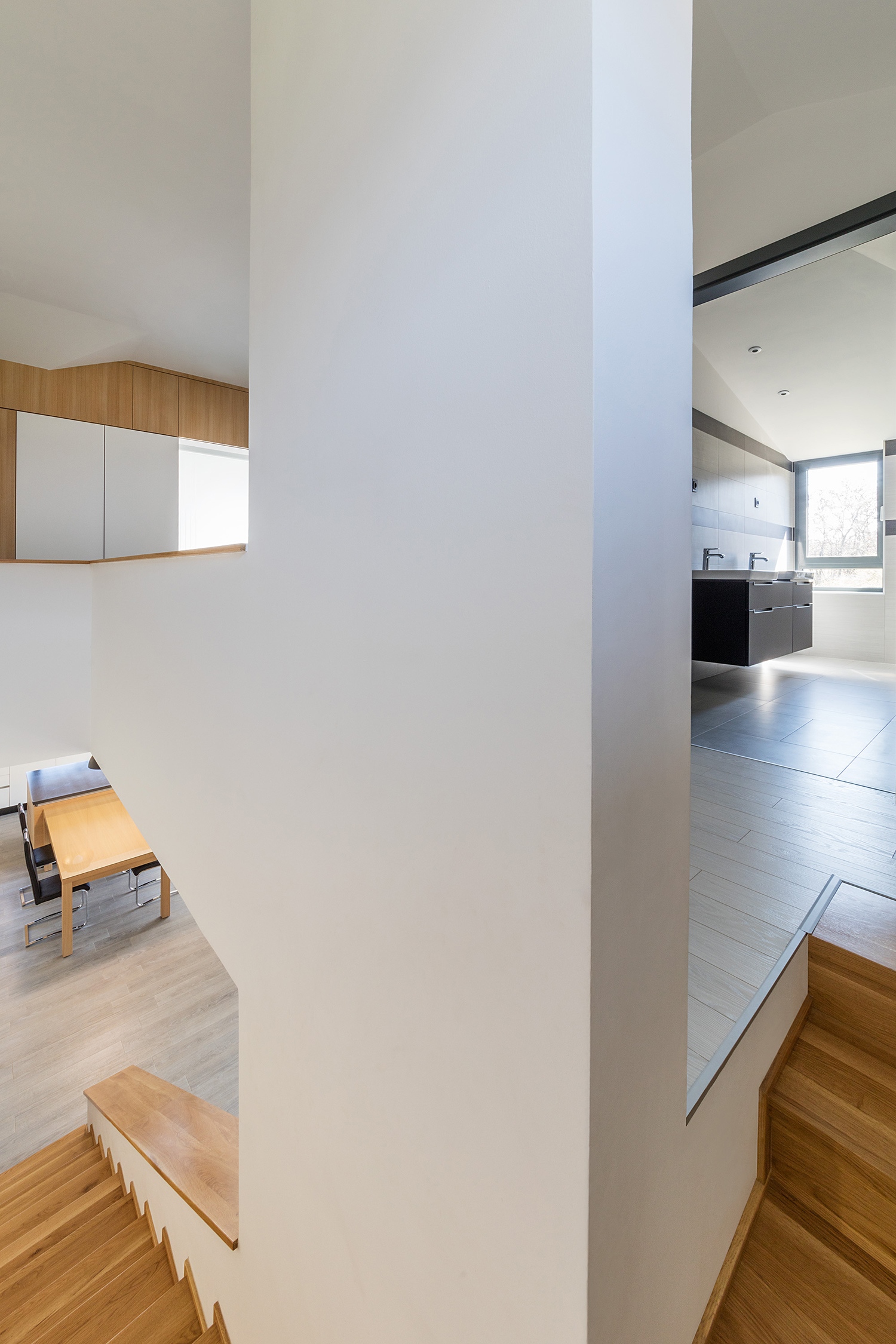 Végül a geometriai arányjáték a belső terek kompozíciójában, az alaprajzi szerkesztésben és a szintek közötti kapcsolatok, áttörések esetében is jól azonosítható. Tiszta képleteket, visszafogott méretű, racionális kapcsolatokat eredményező belső térsorokat látunk, ahonnan a megnyitások inkább a védettebb, fás, hegy felőli oldalra nyílnak, mintsem a már emlegetett elegyes szomszédságra. Ez alól kivétel az észak-nyugatias tájolású emeleti nyitott terasz, ahonnan messzire, a lemenő Nap irányába is ellátni.