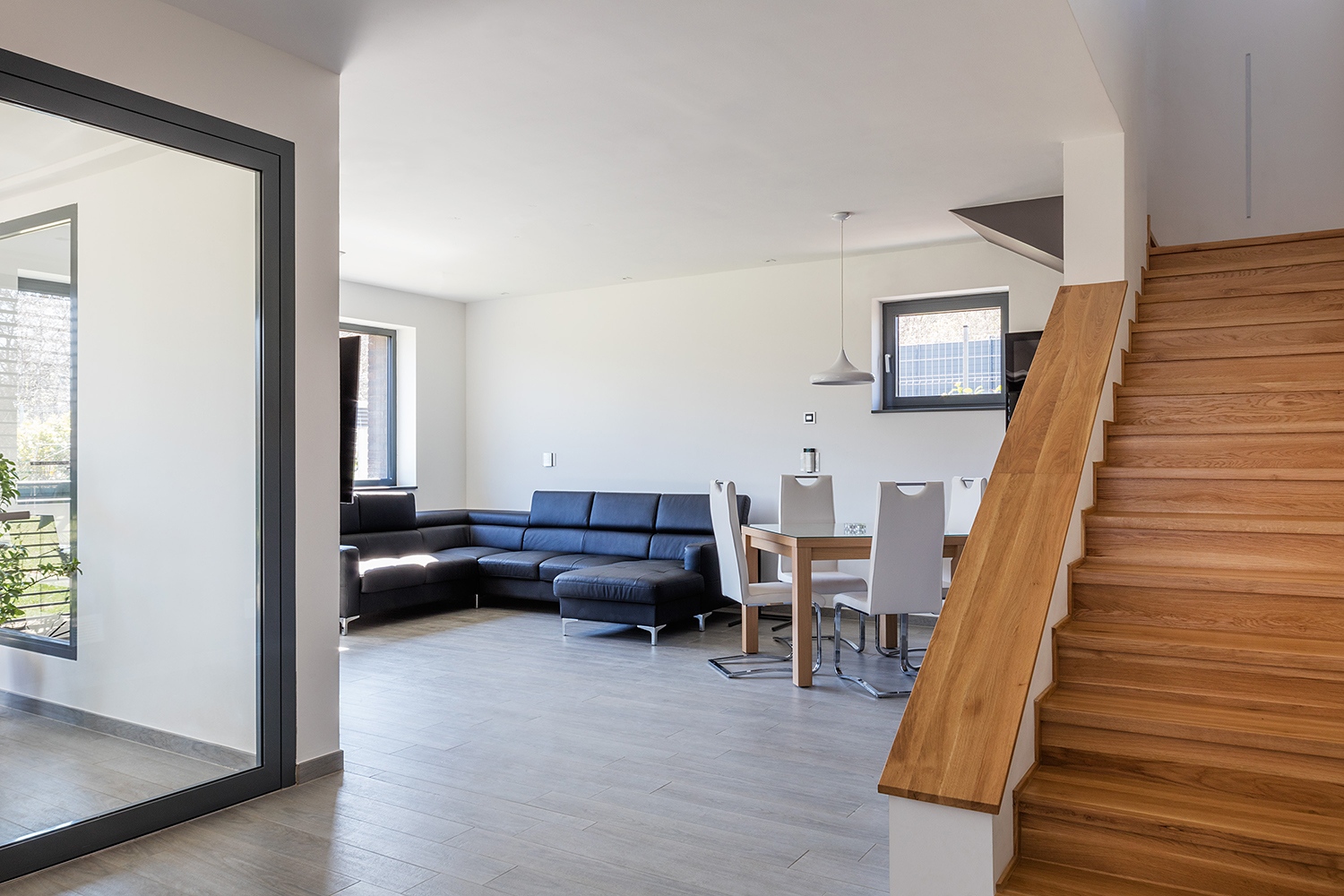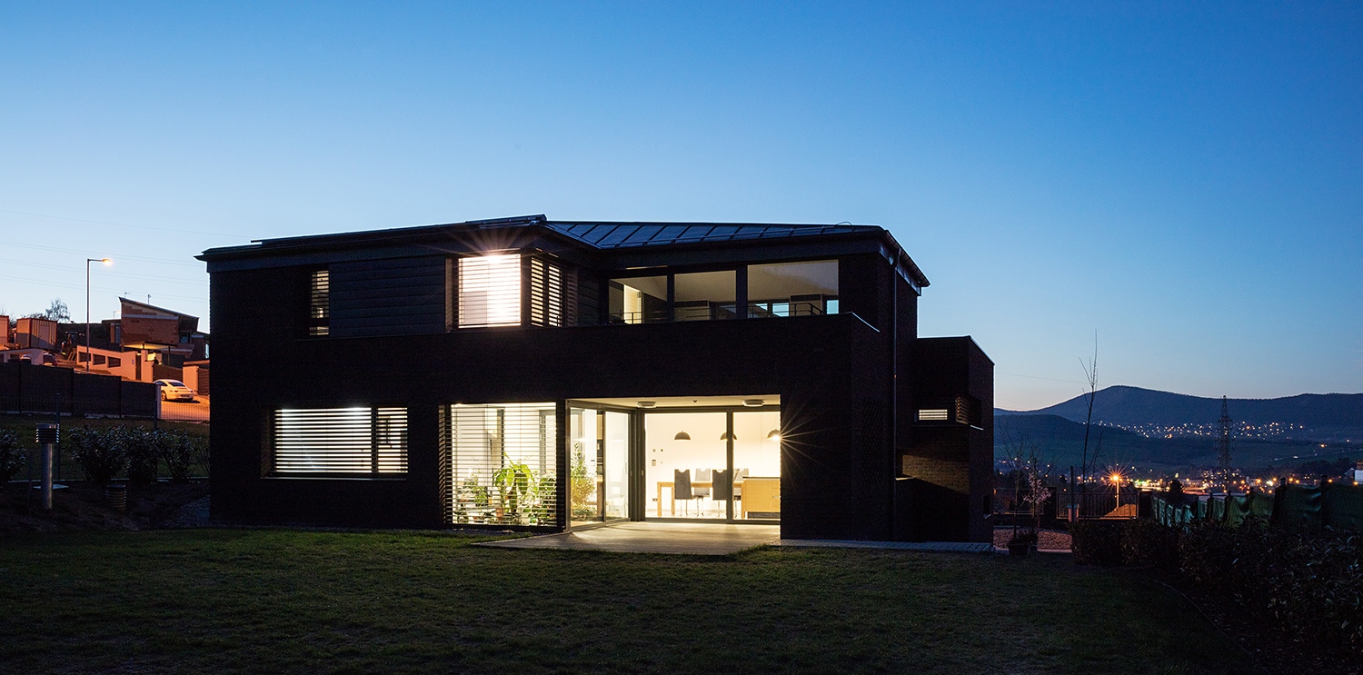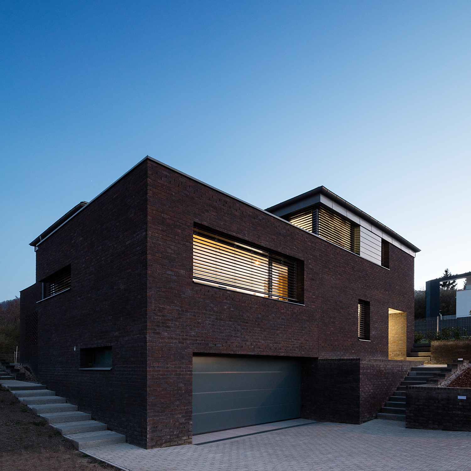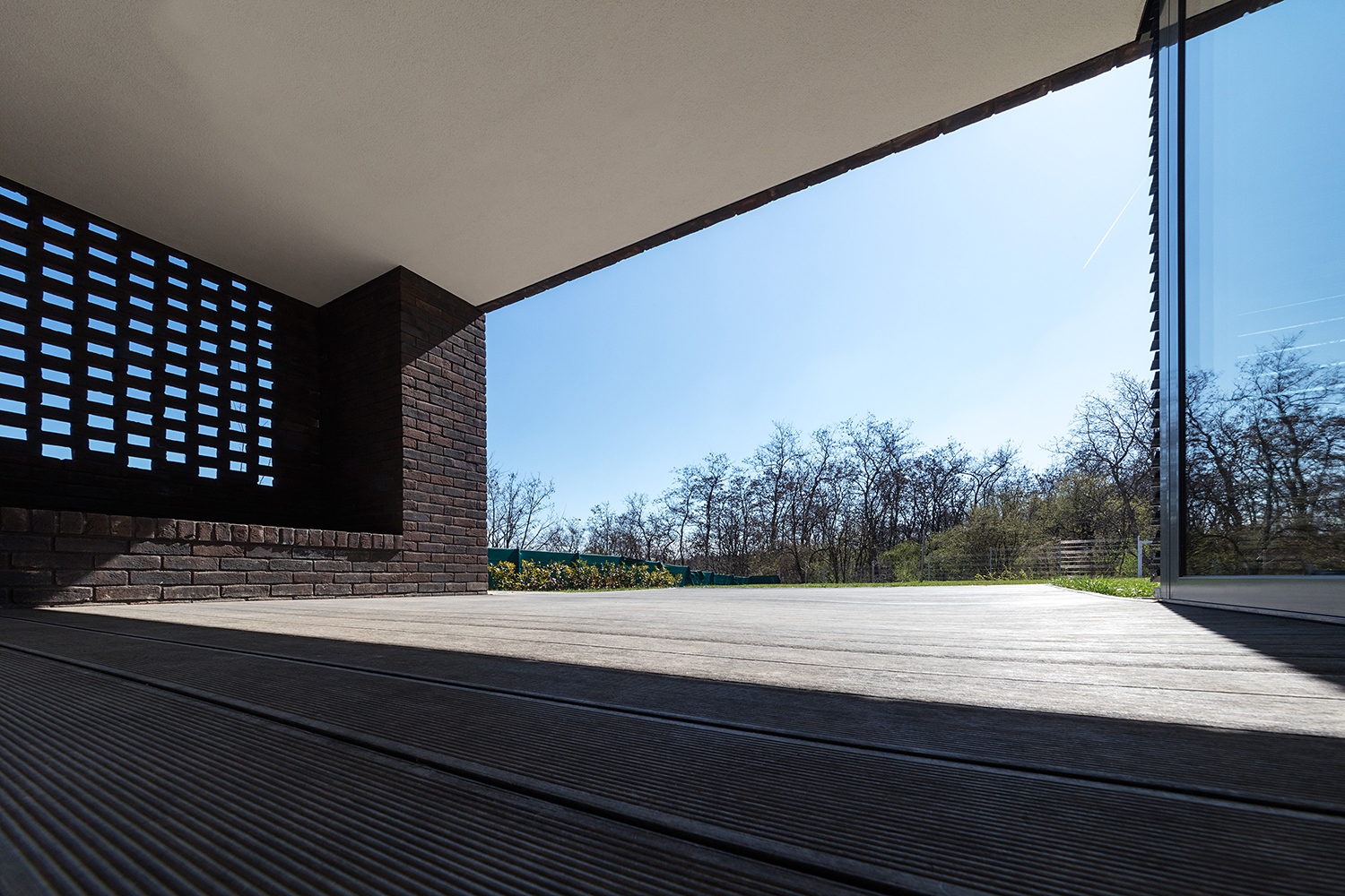 Ennél a háznál azonban a tégla geometriai alapelem, aminek horizontális hangsúlyai az ablakoknál éppen úgy megjelennek, mint a földszinthez képest egy szinttel lelépcsőző garázsnál, valamint a védetten, a ház főtömegének kontúrjába visszahúzott hátsó terasz esetében, ami egyébként egy nyitható üvegfallal az étkezőhöz kapcsolódik, valamint a szomszéd telek felé szép téglaráccsal határolódik el.