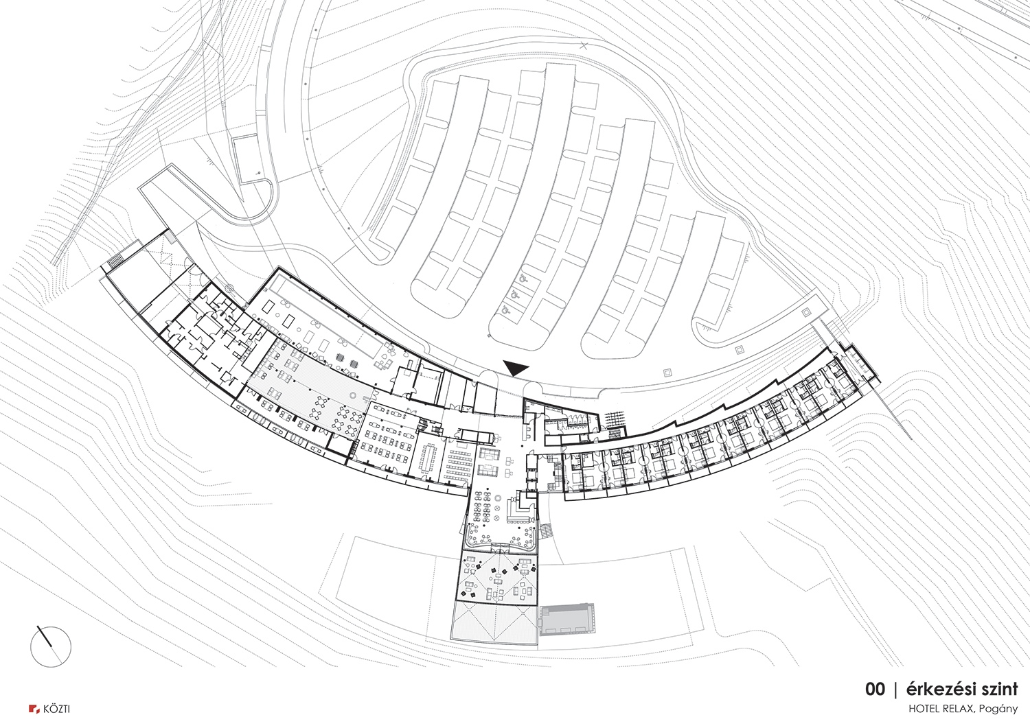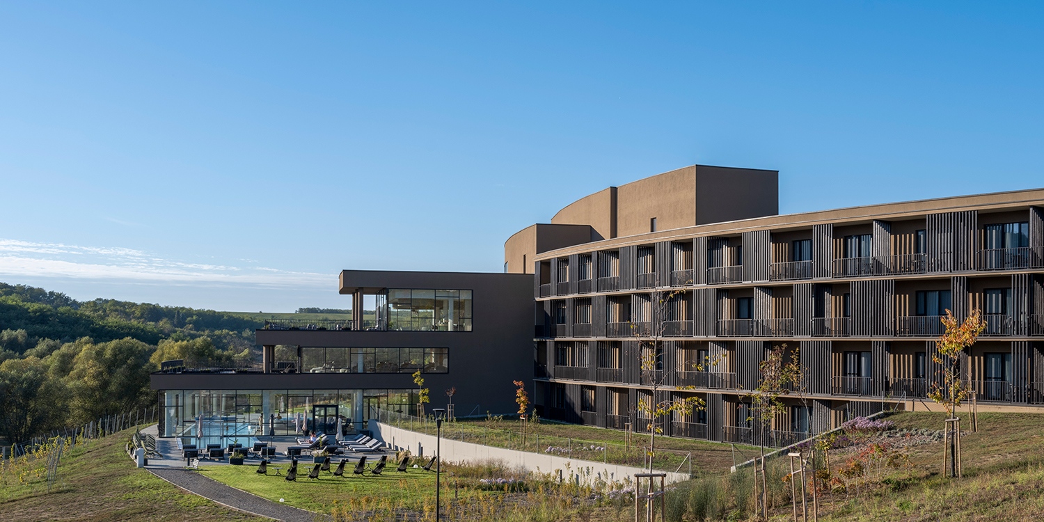 Az így befoglalt ívelt, konkáv lejtőt új telepítésű szőlőkordonok pöttyözik; ezzel az ismerős képlettel, valamint a feltáruló ölelő gesztusokkal jól valósul meg a vendégvárás allegóriája. A hotel ebből a nézetből egy izgalmas szobor. Megnyitások alig törik a lendületes, hagymahéjszerűen egymásra rétegződő tömegi elemeket. Kivételt képez ez alól a jó arányú, fókuszpontba helyezett bejárat. Ez nem egy grandiózus, magamutogató kapuzat, és talán épp ez a léptékhelyesség teszi nemes gesztussá, igazán elegánssá.