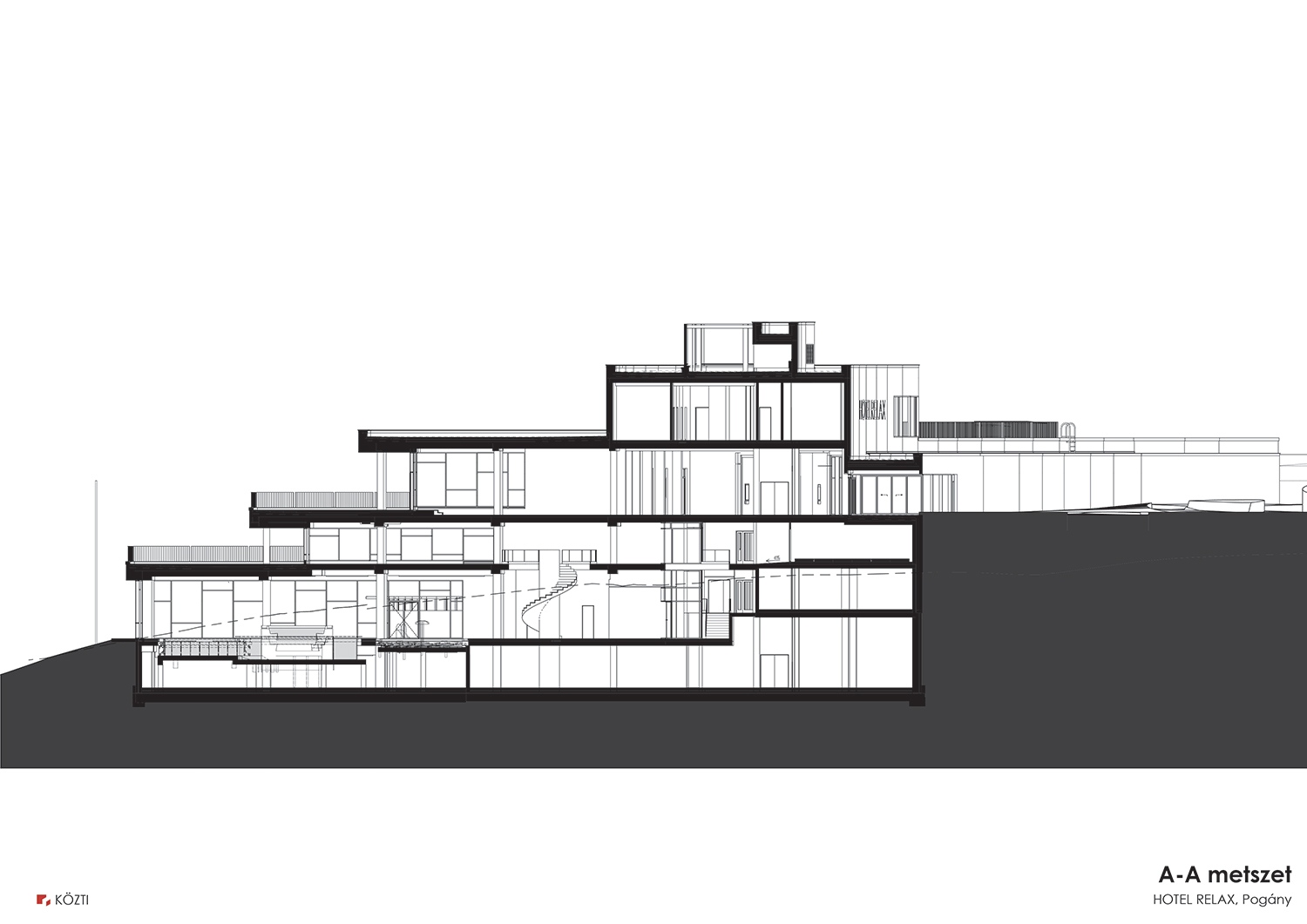 E lemezek mélyen a völgybe nyúlnak, ezzel a már korábban említett sajátos aurájú völgy belsejébe is belelátva. Ugyanis ez a merőleges gesztus ugyanúgy az egyedi atmoszférájú csendes völgyet helyezi a koncepció fókuszába, ahogyan az a határozott állítás is, hogy minden szoba nézzen a völgyre. Kimondani persze egyszerű, hogy a szobákat egy irányba szükséges tájolni. Ugyanakkor nyilvánvalóan hatalmas építészeti kihívásokat is generál ez a beruházói elgondolás. A költségvonzatról később még szó lesz, most elsősorban az építészeti kérdéseket kell itt citálni. A jelentős meredekségű domboldal alkalmat adott arra, hogy három szinten lehessen elhelyezni a szobákat.