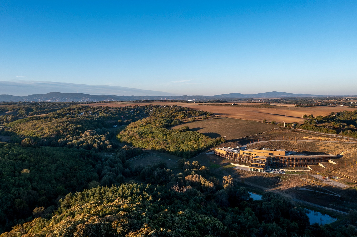 Baranyára gondolva a mentális térkép fókuszában Pécs áll. Nem sokan lehetnek az országban, akik ne különleges helyként tekintenének a városra. Mégis, a turizmusról sokat elmondó adat, hogy az átlagos vendégéjszakák száma alig haladja meg a kettőt. Ez pedig azzal a következménnyel is jár, hogy a város ikonikus hotelei elhagyottak – sebtében hozzátéve, hogy az ikonikus belvárosi szálloda, a Palatinus épp most bontogatja főnixszárnyait. A megye déli régiója Villány és Harkány központokkal már sokkal jobban áll a turizmus-kérdésben, de igazán nagyszabású szálláshellyel ezek a települések sem rendelkeznek. Egyfelől tehát ott van Baranya varázsa, másfelől pedig egy funkcionális hiány. E kettősség szinergiájaként értelmezhető az a beruházói koncepció, miszerint egy új, százszobás hotel számára olyan helyzetet keresett, amely földrajzi értelemben az előbb említett helyek közötti súlypontban van, de mégis saját aurával bír.