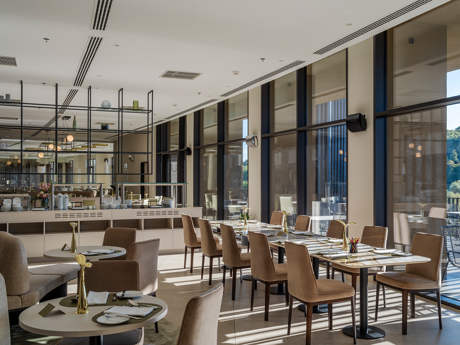 A folyosók egyik oldalán azok a szobák tehát, amelyek az üzleti koncepció mentén hármas tagolásban követik egymást, megfelelő sorrendben a kis, közepes és nagy szobák. Ezzel olyan összenyithatóság jön létre, amely nagyfokú szabadságot ad a családos foglalhatóságban. A folyosó másik oldala pedig a személyzetnek dedikált terület. Öltözők, mosoda, szobaasszonyi szoba kapnak helyet, míg a legalsó szinten a hatalmas gépészeti rendszer. Mindennek a hangulata olyan, mint egy tengerjáró hajó műszaki oldala: zárt rendszer ugyan, de végtelenül pragmatikus. Ez a látogatók elől koncepciózusan elrejtett világ mintegy hetven alkalmazottnak ad munkahelyet.