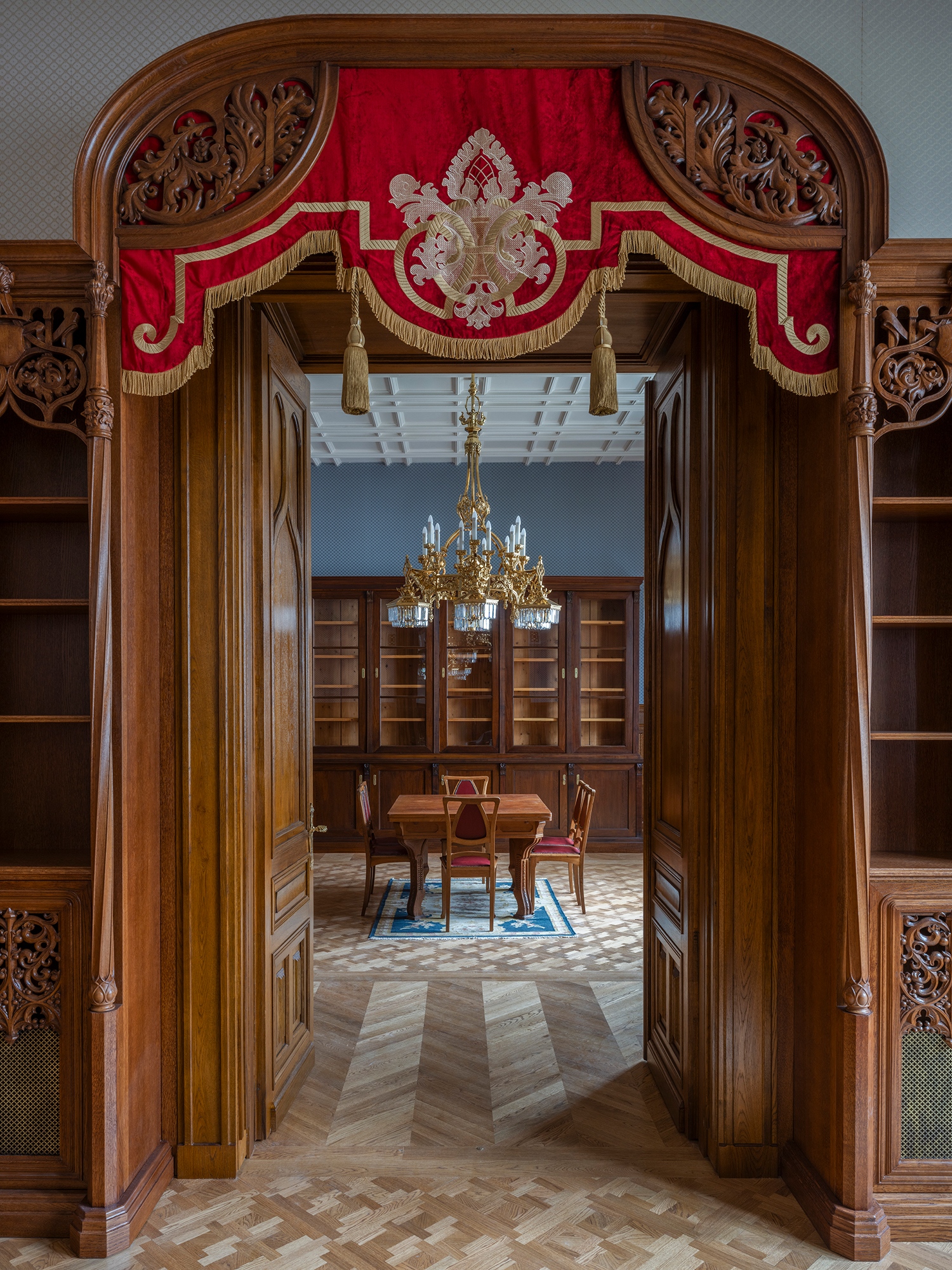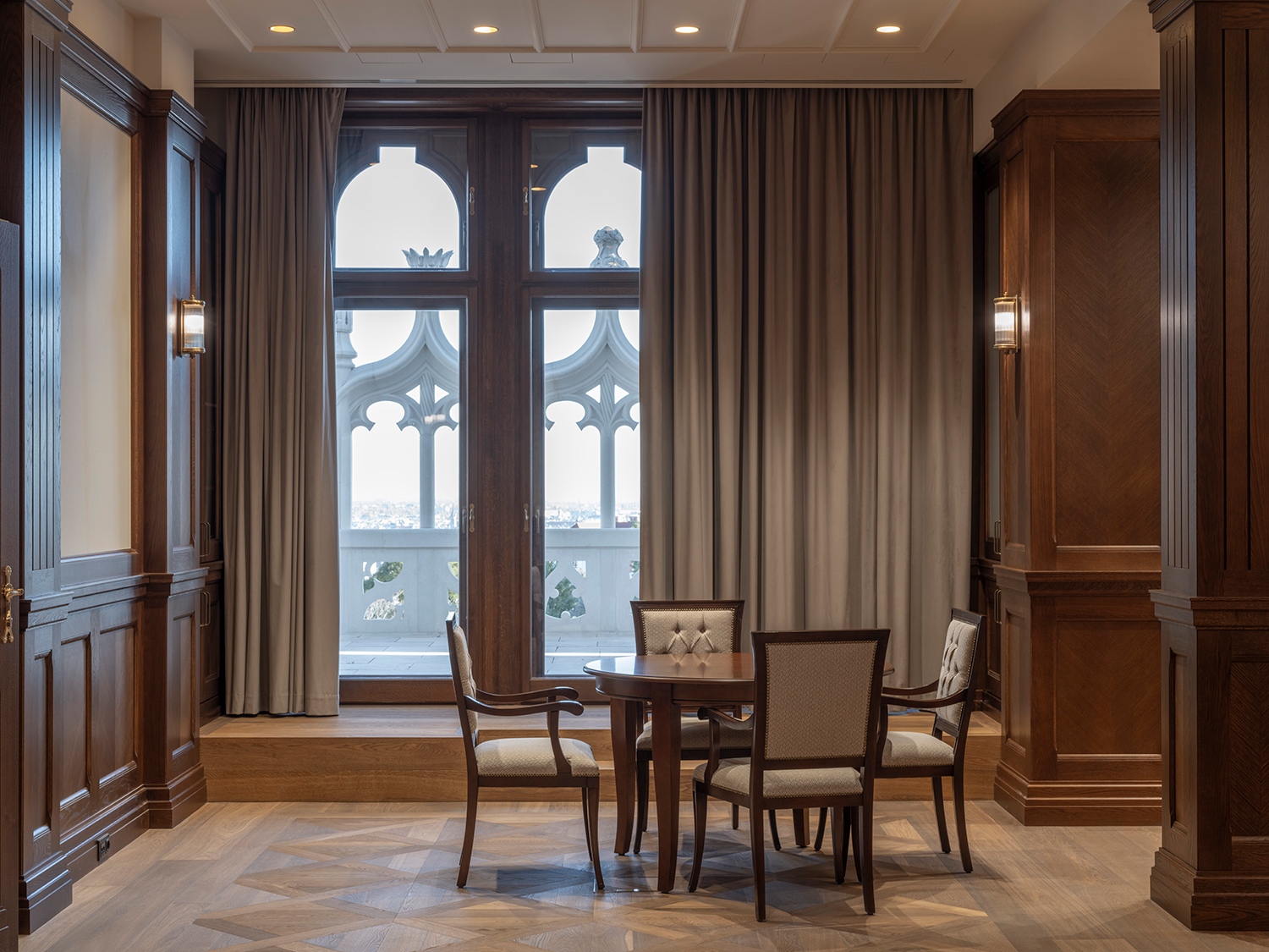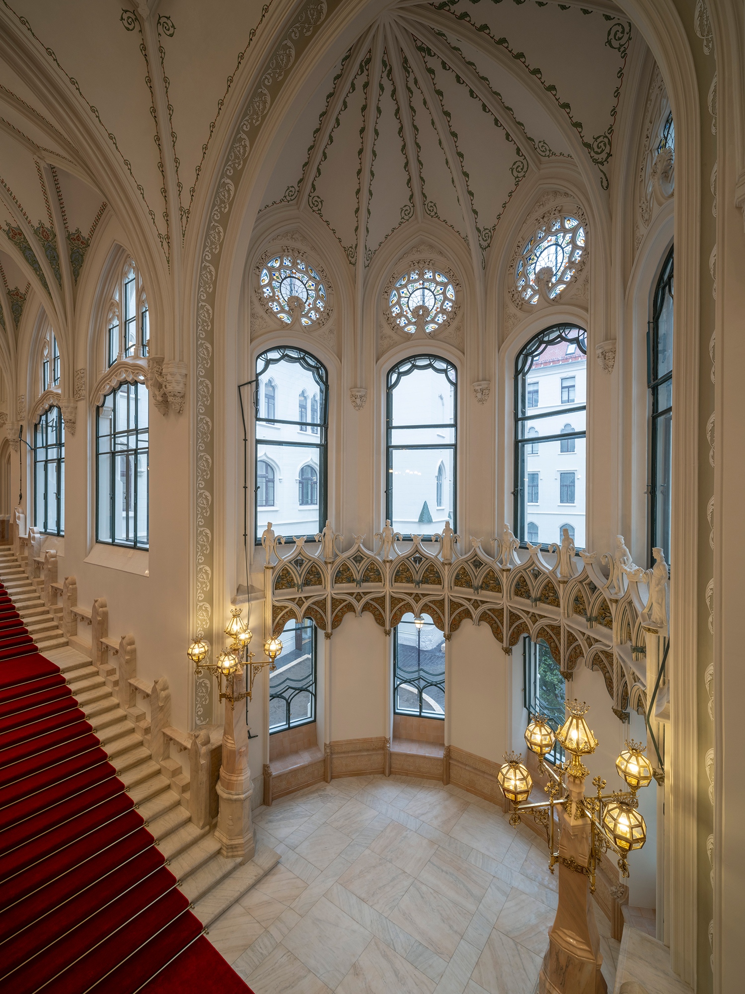Nagy érdeme az egész projektvezetésnek, hogy kellő idő volt tanulmányozni az eredeti állapot történetét, kialakítását és ezáltal megalkotni az 1904-ben elkészült megjelenés elméleti-tervi rekonstrukcióját. A palota a gótika nem csupán formai, de szerkesztési elveit is elsajátító, részben viszont szecessziós jegyeket is becsempésző belsőépítészetét jobbára a semmiből kellett azonban vizionálni. Lukács Zsófiának a legtöbb térnél nem is a régi tervi anyag, hanem az archív fotók jelentették a fő forrást. Egy kétdimenziós felvétel ugyanis perspektivikus látást másolt egykor, de inverz módon mi a jelenben ugyanúgy vissza is másolhatjuk róla a valódi 3D teret.
