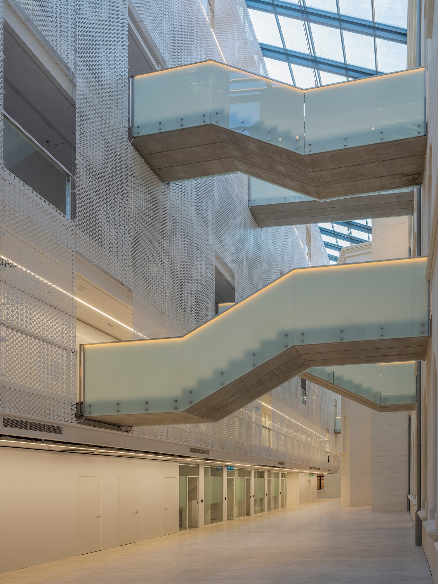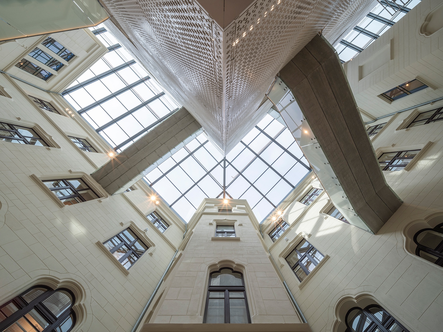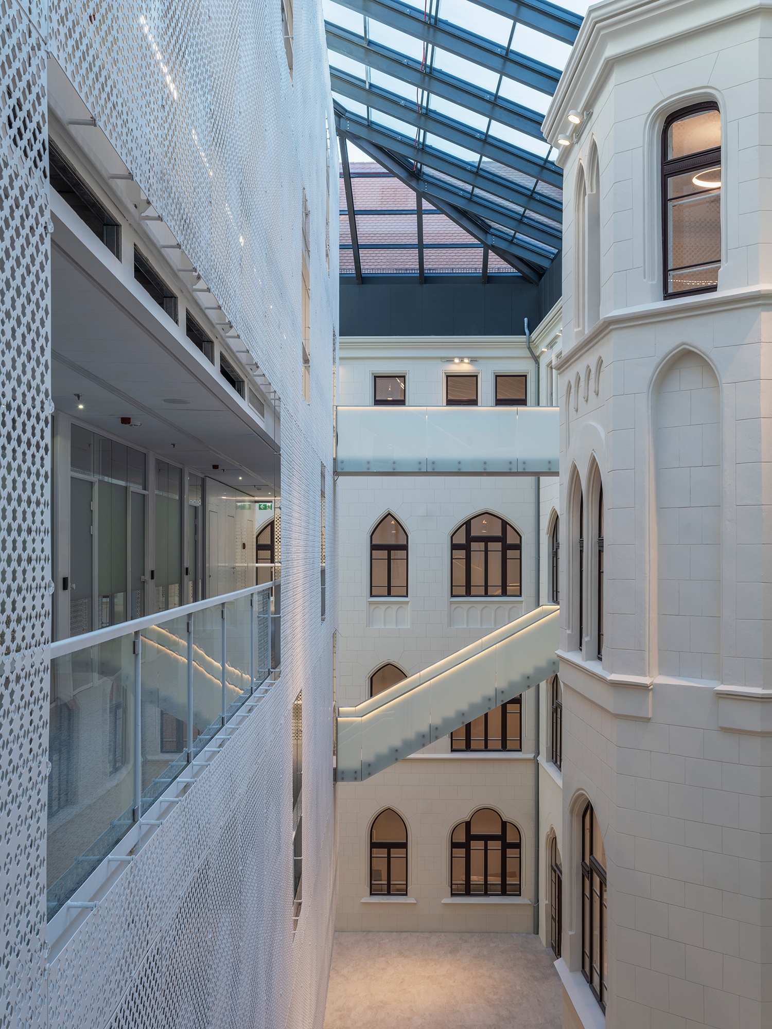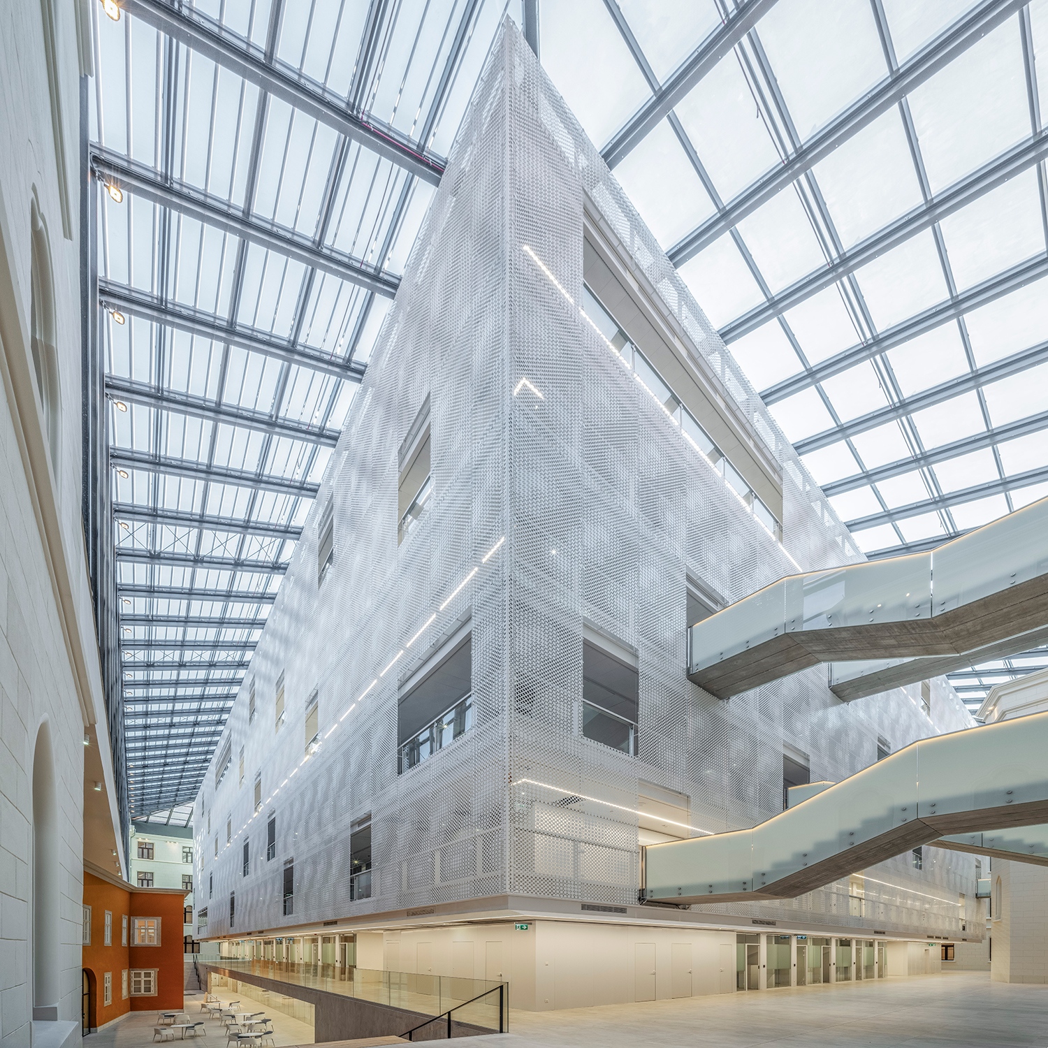 A modern kubatúra belsejében többnyire kétszemélyes, intim irodák sorakoznak, és külső folyosós elrendezésben lehet hozzájuk bejutni. Akárcsak a Fellner-féle struktúra, itt sem akartak középfolyosósítani. Tömegét átfedi egy perforált lemezfátyol, melynek mintája a régi épületben látható díszes szellőzőrácsok mintáit absztrahálja. Látványos és élvezetes vízió az egész, főleg, amikor a belső modern irodák fényei miatt az árnyéka felöltözteti a régi szárnyak falait. Apró gesztusokkal reflektálnak a Fellner-féle épület karaktereire és elveire, zárt irodai struktúra helyett pedig minden réséből rálátás nyílik egy régi, történeti felületre legalább. Ezek a pillantások az eredeti tervezőnél is szempontok voltak: egy ekkora épületben ugyanis mindez a tájékozódást is segíti. Az első udvar tornyai, gótizáló részletei irányt mutatnak, bármely szint óriás és monoton folyosóján járjunk is.