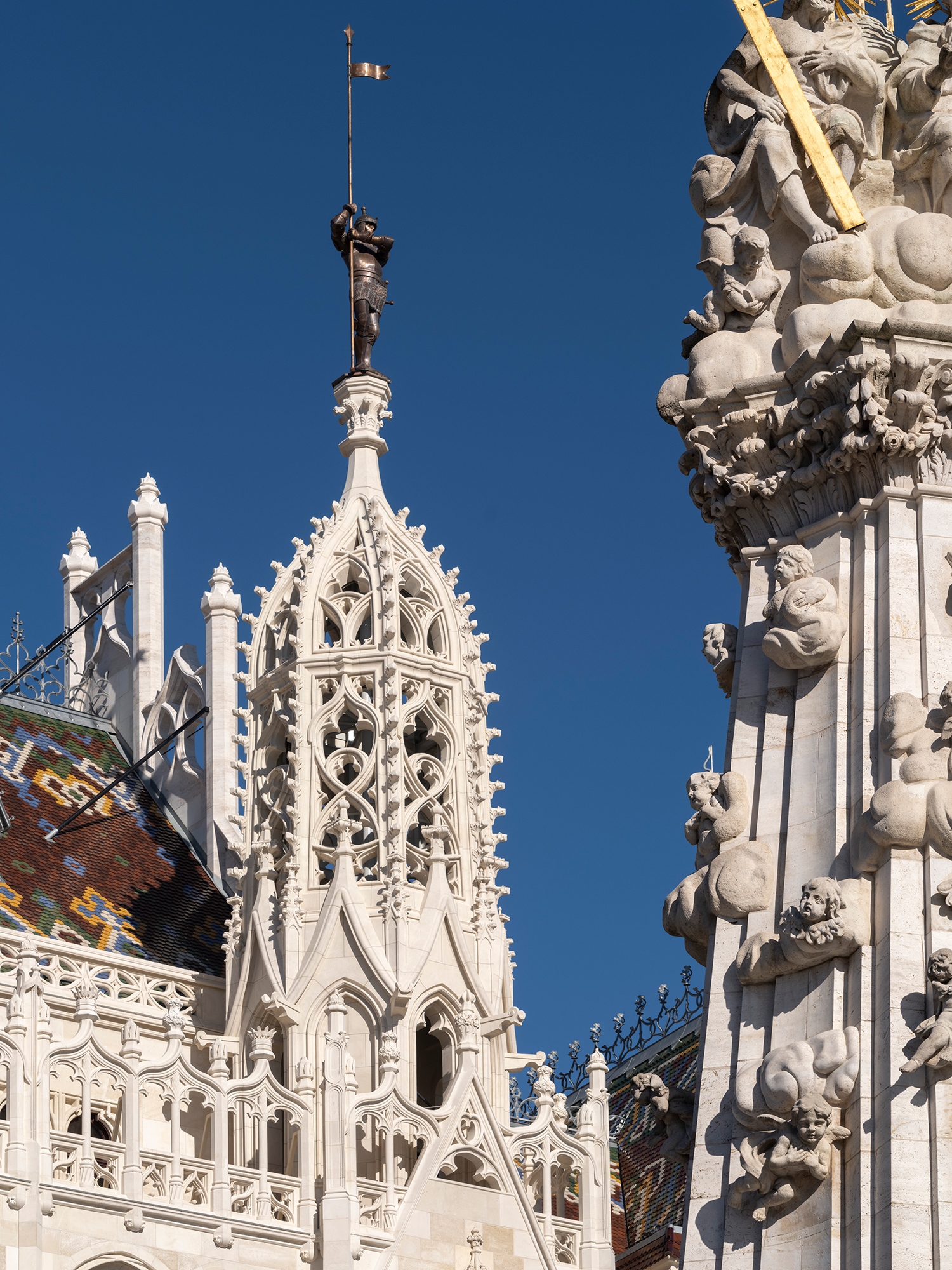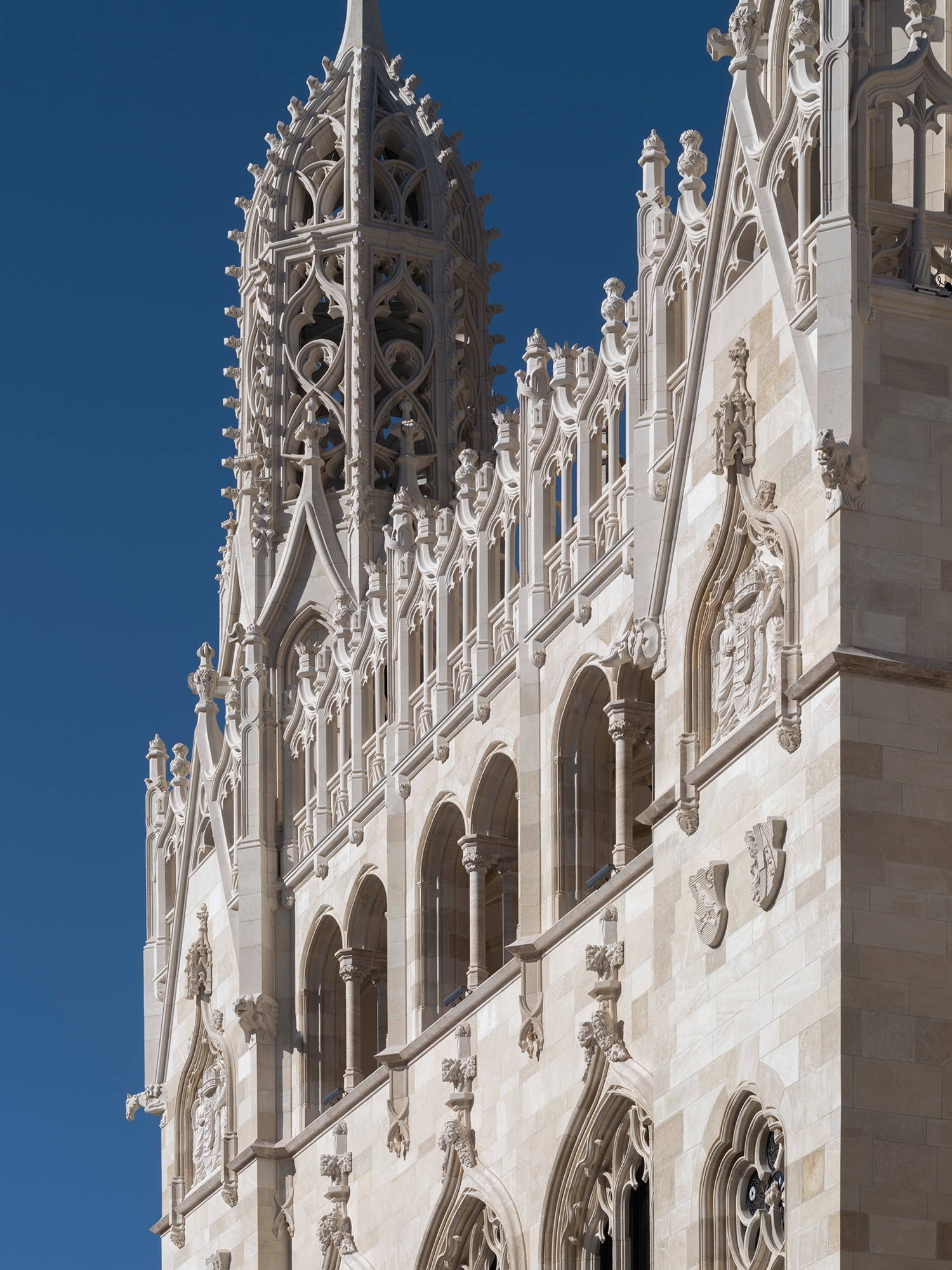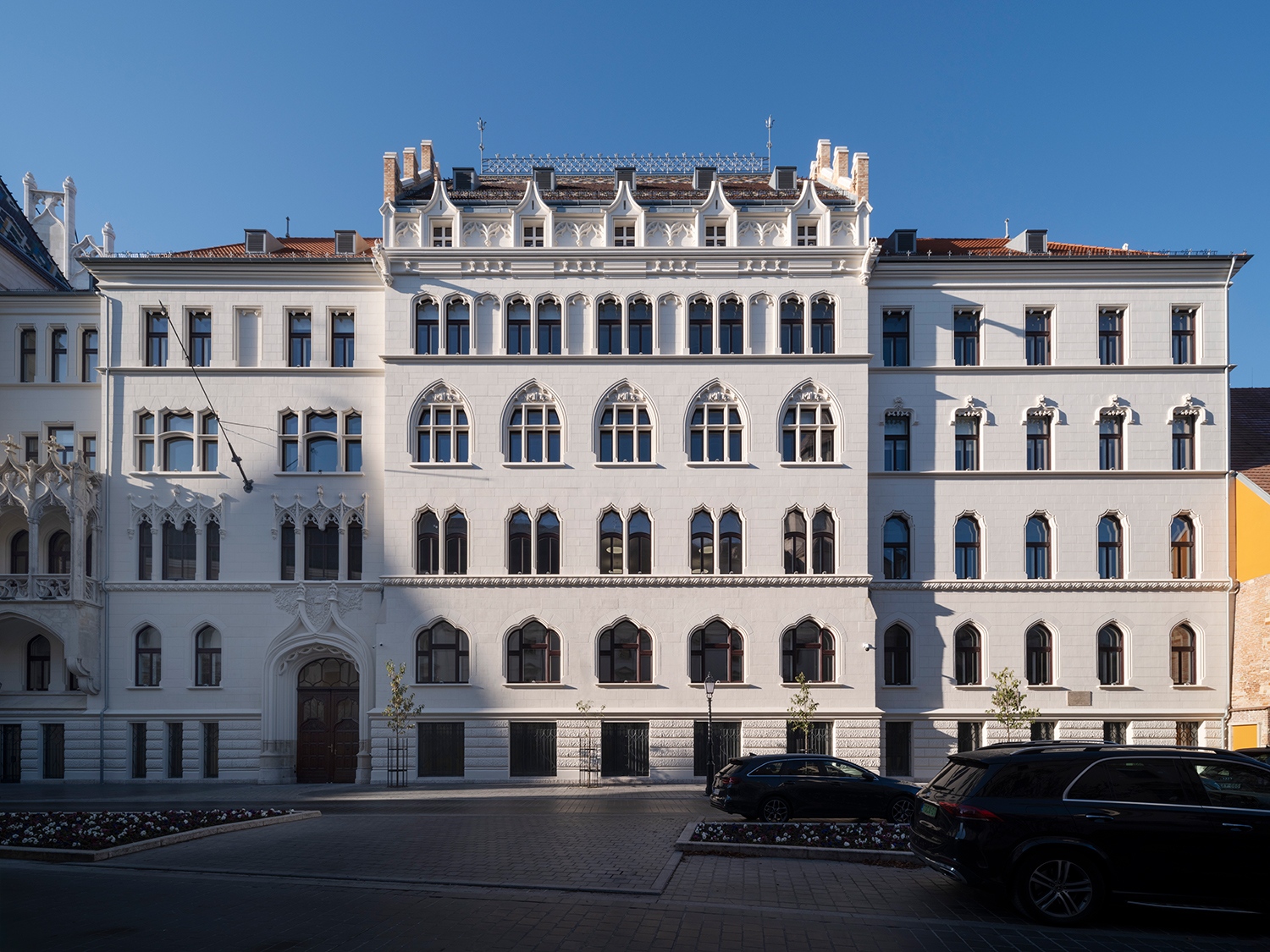 Ezért tűnhet fel, hogy a Fortuna-házzal szomszédos szárnyaknak kontyolt a teteje a korábbi befejezetlenség helyett. A szemfülesek pedig azt is észreveszik, hogy maga a Fortuna korábbi új tetejét használtabb cserepekkel és magasabb tetővel látjuk viszont. Utóbbi oka, hogy az Arch-Studio egy nagyon modern irodarészt tervezett alá. A legradikálisabb különbség azonban természetesen az áttört toronysisak-pár a főhomlokzaton. A bécsi Maria am Gestade tornyáról mintázott forma Fellner eredeti terve szerint is áttört lett volna. Itt kanyarodom vissza a feljebb említett kérdéskörhöz, miszerint a tervek fennmaradása olykor nem fontosabb forrás az archív fotóknál.