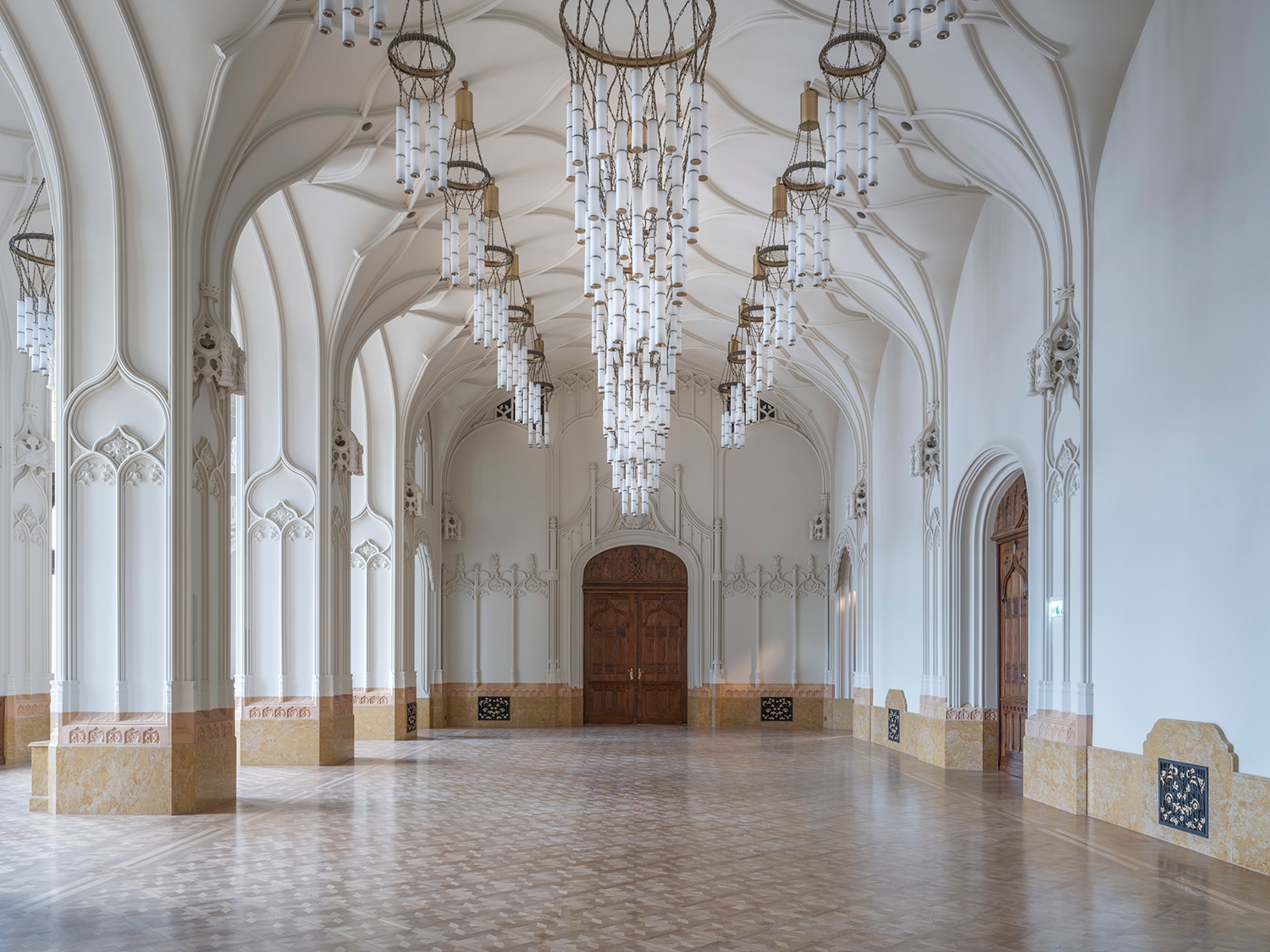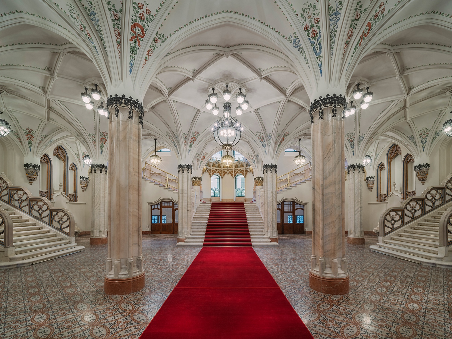 Az egyes szakági kivitelezőkkel óriási utazás lehetett kitapasztalni az 1900-as évek elején még mindennapinak számító utakat, és ezáltal létrehozni egy új történeti kivitelező generációt napjainkra. Egy kézzel festett üvegablaknál sem álltak például rendelkezésre színes fotók Herczeg Ágnes számára, aki ennek a területnek a kivitelezéséért felelt. A próbanézeteket vissza kellett fekete-fehéresíteni, hogy lássák, melyik választott színnél lesz olyan az árnyalat, mint a régi fotókon. Aztán persze a kész méret, a helyszín sajátos fényei mindezt felülírták újra, és a tökéletes összhatásig kellett tovább űzni a sziszifuszi folyamatot. A Fellner-féle díszalbumban van fotó pár elképesztő csillárról is, de nem a teljes térben látjuk őket, és csak bizonyos szögből tűnnek fel.