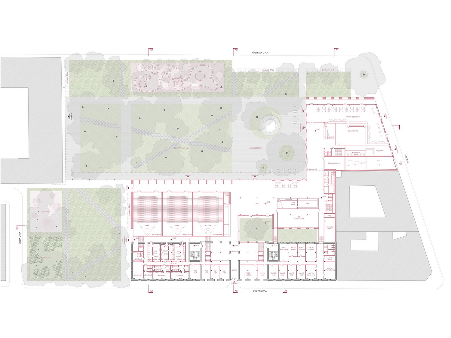 A kiírástól eltérően pályaművünkben a tornaterem a Markusovszky tér felé eső Kinizsi utca telekrész 1. emeletére kerül, a közterület felől is közvetlen és akadálymentes feltárási lehetőségekkel. Ennek a pozicionálásnak számos előnye van amellett, hogy leválasztható megközelítését és térkapcsolatait is segíti az elrendezés: az utcaszintről való kimozdulás lehetőséget ad a földszinti területek park felőli oldalának intenzívebb – interaktívan kommunikáló –megnyitására, élettel teli tanuló-, közösségi tér elhelyezésére, valamint így a földszinten teret nyerő lépcsős kialakítású nagyelőadók szintén leválasztható használatára, tehát akár külön rendezvények, konferenciák lebonyolítására is. A föléépítés kényszerétől megszabadított nagy fesztávú tornaterem szerkezete és megjelenése is felkönnyül, amellett, hogy ezzel teret enged a volt dohányraktár épület Markusovszky tér felőli homlokzatának is.