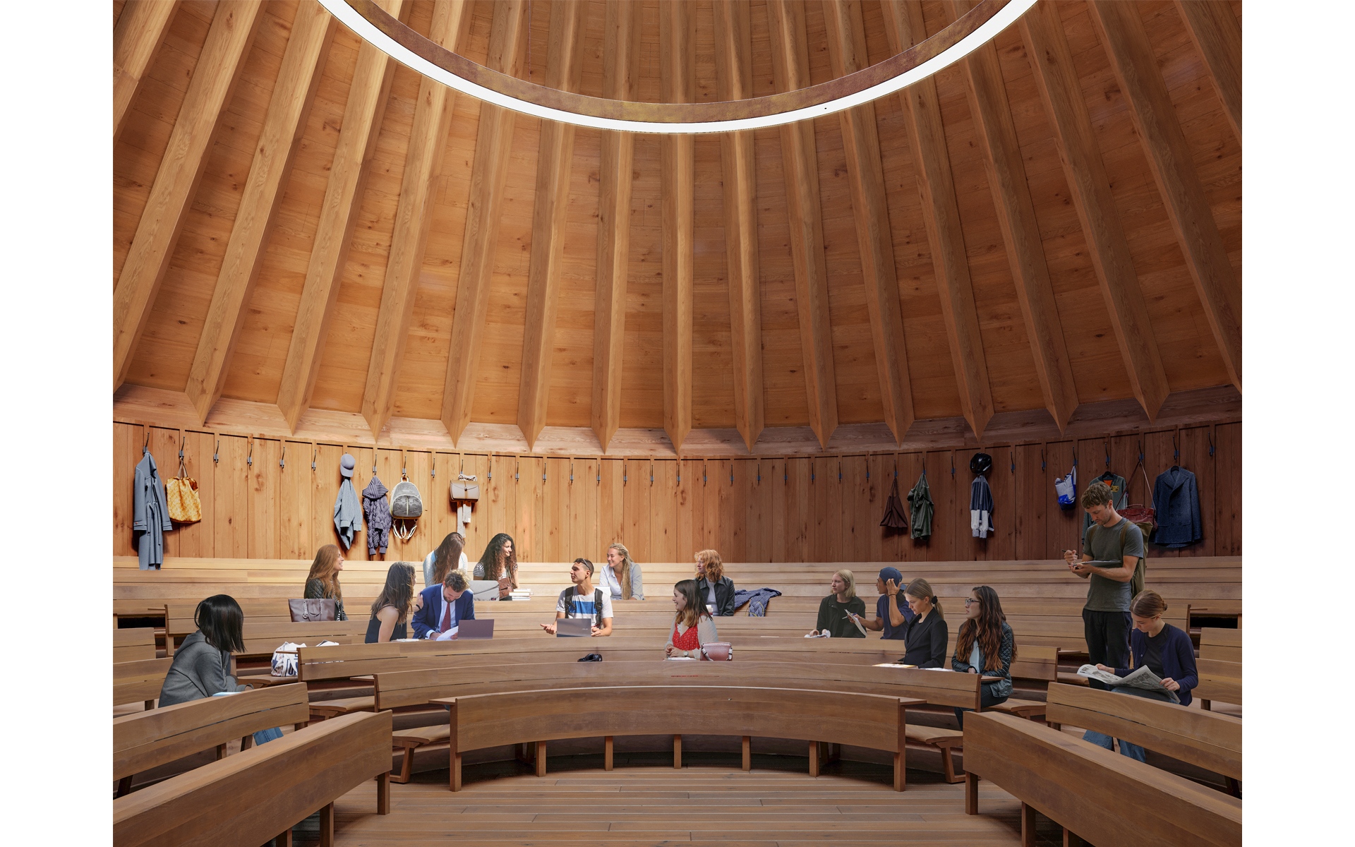 Az aula nemcsak alaprajzával, de téri formáltságával is összeköt. Itt találkoznak a földszint, az első és második emeletek belső útvonalai, a meglévő ház közlekedője, a jogi és pszichológus tömb átjárói és a várossal megosztható sport-könyvtár-kápolna-előadó egymástól részben elválasztott világai, és az épülettömbök közötti külső terek is erre nyílnak. Így tárul fel a Markusovszky teret az egyetem polgárai számára kiegészítő köztér-, kert- és udvarrendszer és a Budapest külső-belső térstruktúráját továbbíró egyetemváros központja, ahol a Károli közössége együtt van és tanul.