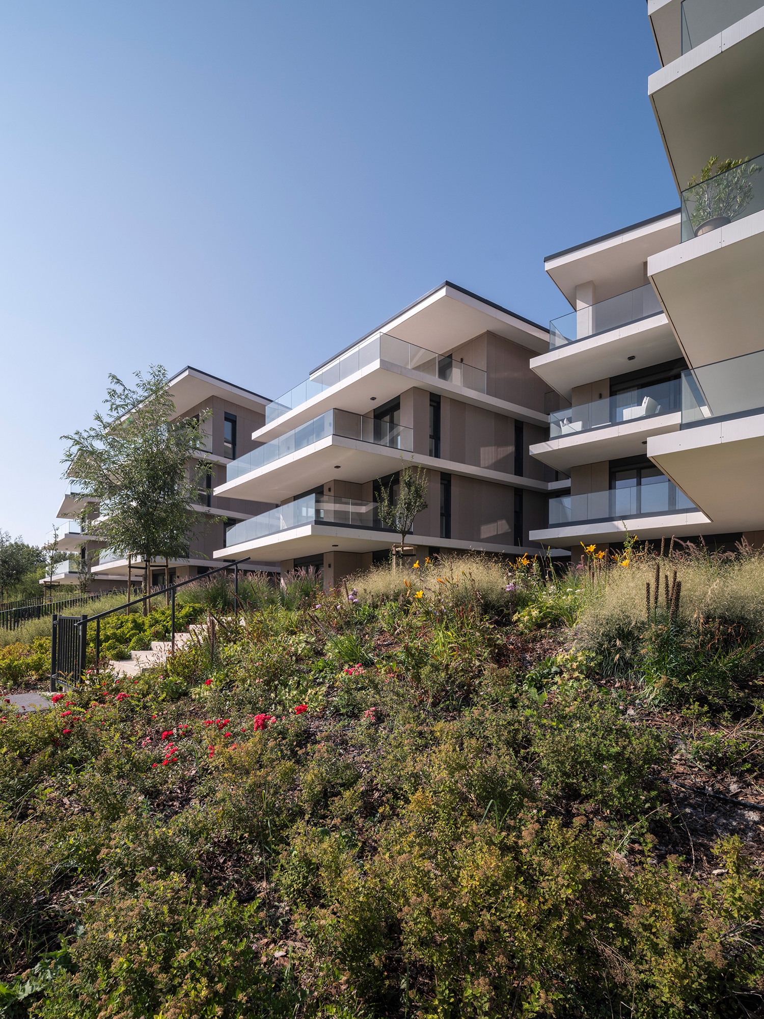 Az út túloldalán viszont elérkezünk a harmadik fajta épülettípushoz. Nem érdemes mellébeszélni – itt nyilvánvalóan a felsőkategóriás lakások értékesítése zajlik a legszebb kilátásokkal, szintenként egy-egy óriási ingatlannal. A tömegek síkjai meg vannak mozgatva, táncoló födémek segítik a mögötte lévő házak számára is a zöld látvány csatornáit megnyitni. A homlokzatokon átszellőztetett szálcement homlokzat, valamint textil árnyékoló jelenik meg, ami eltér a szokványos, fém lamellás megoldásoktól.