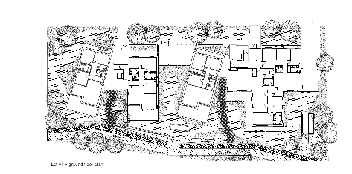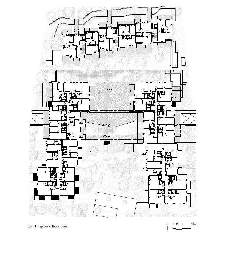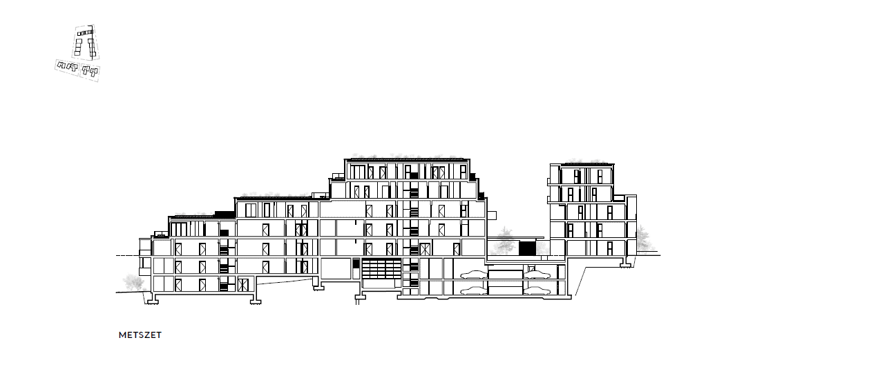 A második épülettípus a csökkenő magasságokkal rendelkező, különböző homlokzati osztású lakótömb-csoport, amely a szintkülönbséget lekövető látványos park köré szerveződik. Ezen lakások esetében inkább a családi modellben gondolkodtak. Lélegző otthonérzet és térszervezés, több oldali megnyitások, a belülről kifelé haladó tömegfelépítés jellemzi őket. Unalmas, hosszú és sötét belső folyosó helyett az allék lekövetik a lépcsőzetes struktúrát.